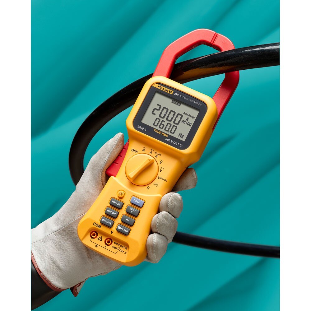 Versatile and rugged tools for applications with high currents. Confidently take reliable readings with the True RMS, Fluke 355 digital clamp meter the tool of choice for high current clamp-on amp meter measurement up to 2000 A. The extra-wide jaw easily clamps around large conductors, typically found in high-current applications. The extra rugged design and CAT IV 600 V, CAT III 1000 V ratings add an extra element of user protection when taking high-powered measurements.