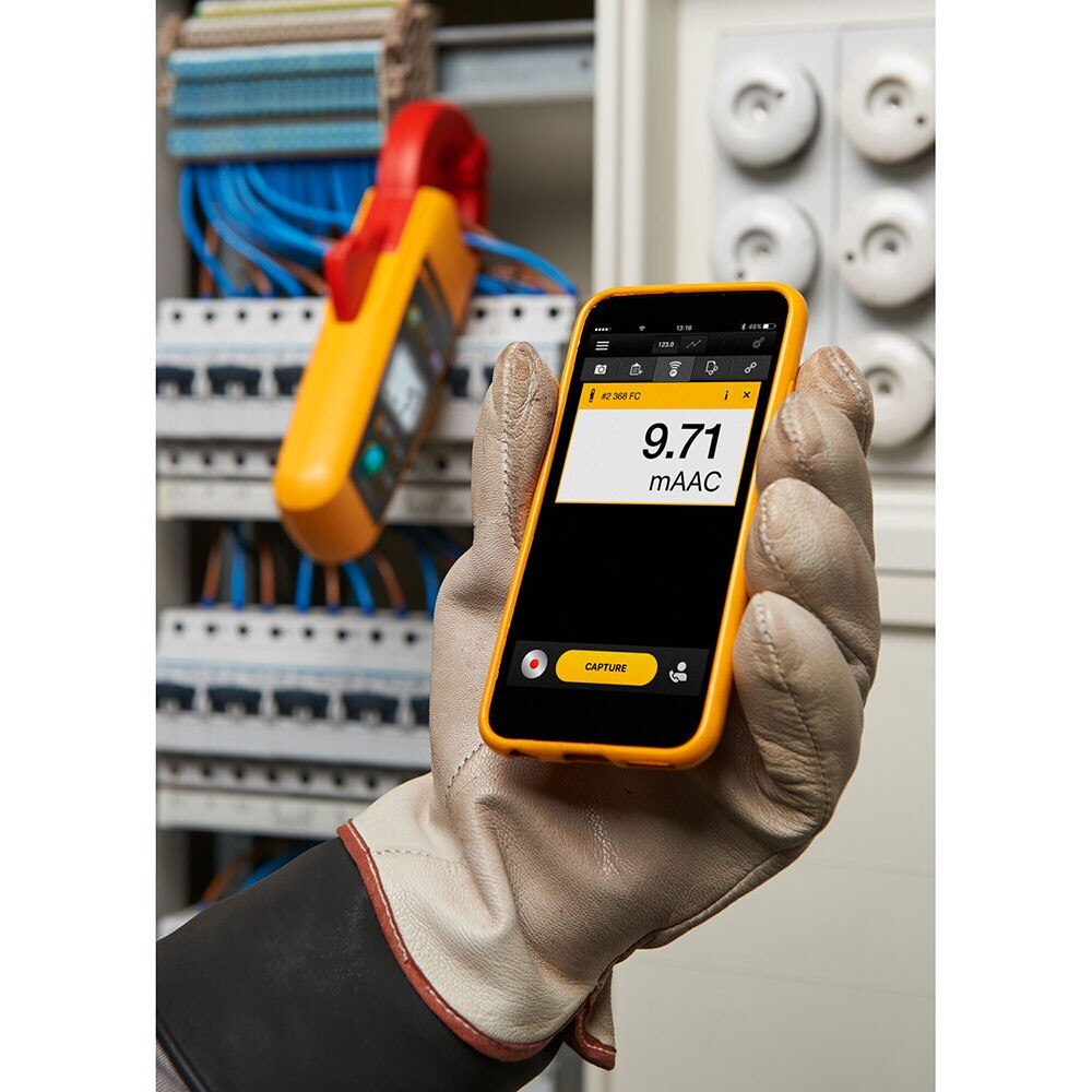 The Fluke 368 FC true-rms leakage current clamp meter helps users detect, document, record and compare leakage current readings over time as a means of preventing unplanned downtime, and identifying intermittent GFCI and RCD trips, all without taking equipment off line. The Fluke 368 FC has a large 40 mm diameter jaw for work with large conductors. The clamp’s jaw is fully shielded to accurately capture very small leakage signals, and to minimize external electromagnetic interference. The 368 FC also offers wireless data connectivity via Fluke Connect. As part of Fluke Connect — the industry’s largest system of software and more than 40 wireless test tools — the 368 FC allows you to track changes in leakage current over time, helping to identify potential problems before they turn into major failures.