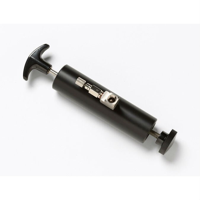 - Pump incorporates a needle valve for venting and a volume adjust vernier for precision adjustment of pressure