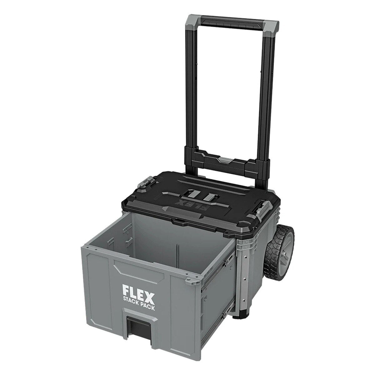 Roll tools and supplies to and from the jobsite with the FLEX STACK PACK 1-Drawer Rolling Tool Box. It features an auto-locking front-loading drawer on durable steel rails, rugged 9-inch rubber wheels for rough terrain, and quick-connect latches for fast stacking in a customized STACK PACK configuration.