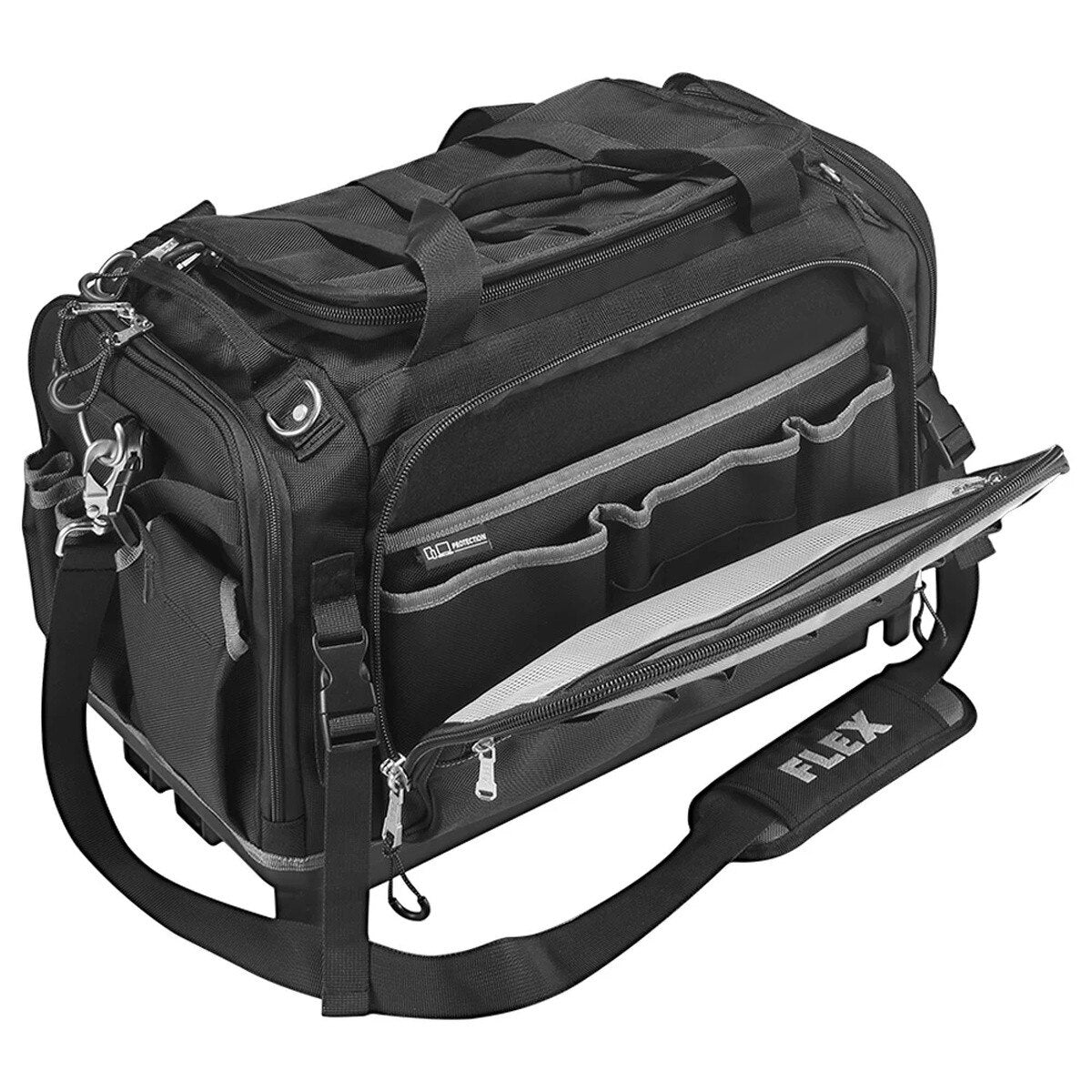 The FLEX STACK PACK 22 in. Tool Bag keeps jobsite essentials organized with 80 pockets and slots, durable 1680D ballistic polyester construction, and quick-connect points for attaching to compatible STACK PACK toolboxes. A padded shoulder strap and multiple handles make transport comfortable, while the heavy-duty design supports up to 80 lb load capacity.