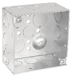 2-1/8 inch deep 4-in square welded boxes with (6) 1/2-in & (6) 1/2-in - 3/4-in Side Knockouts and (1) 1/2-in (1) 3/4-in & (2) 1/2-in - 3/4-in Bottom Knockouts are installed in walls or ceilings for lighting fixtures switches receptacles or other outlet devices. Square boxes are used to bring power to a number of electrical devices where multiple conductor runs are split in two or more directions. Garvin's 4S Boxes can be surface or flush mounted when multi directional conduit runs are necessary.