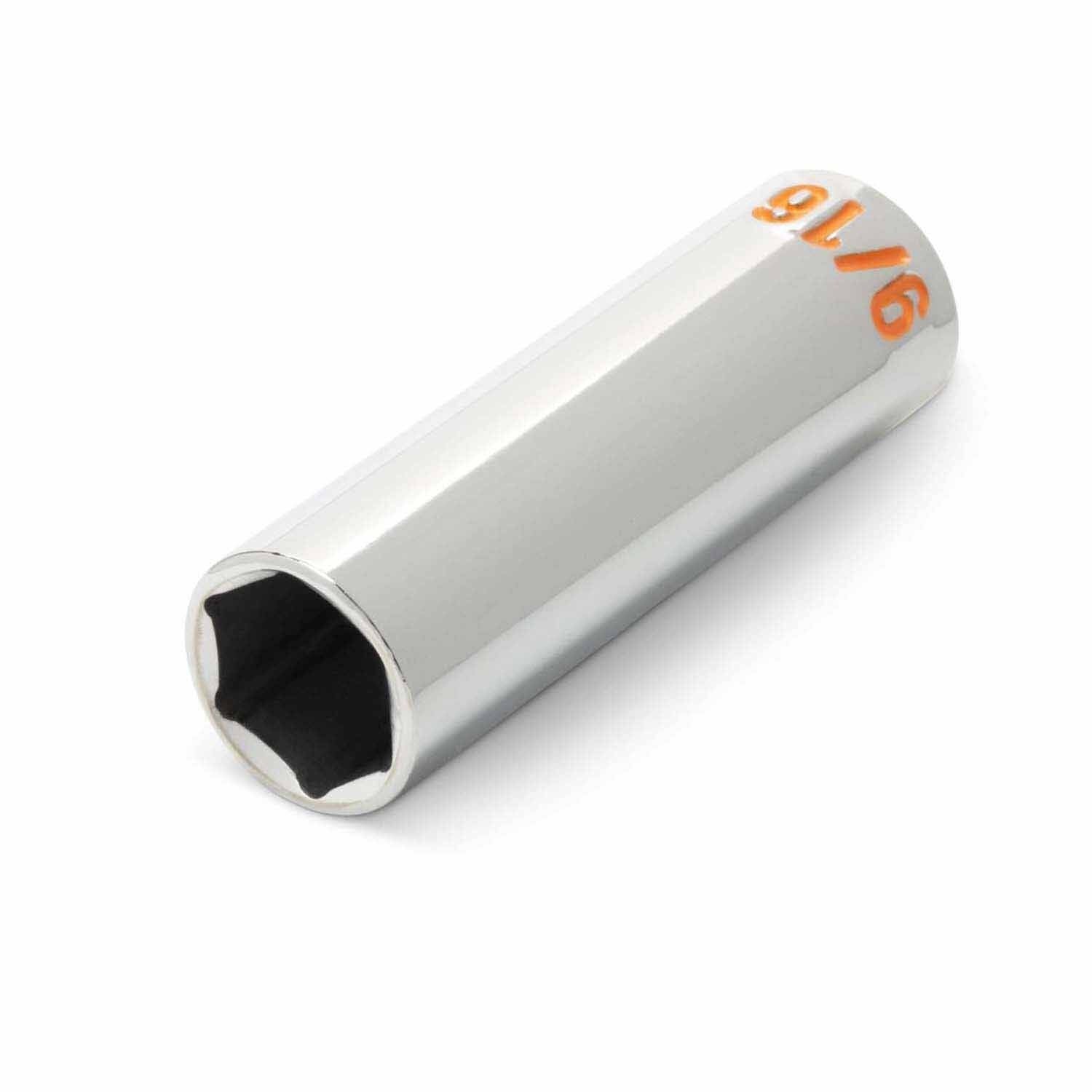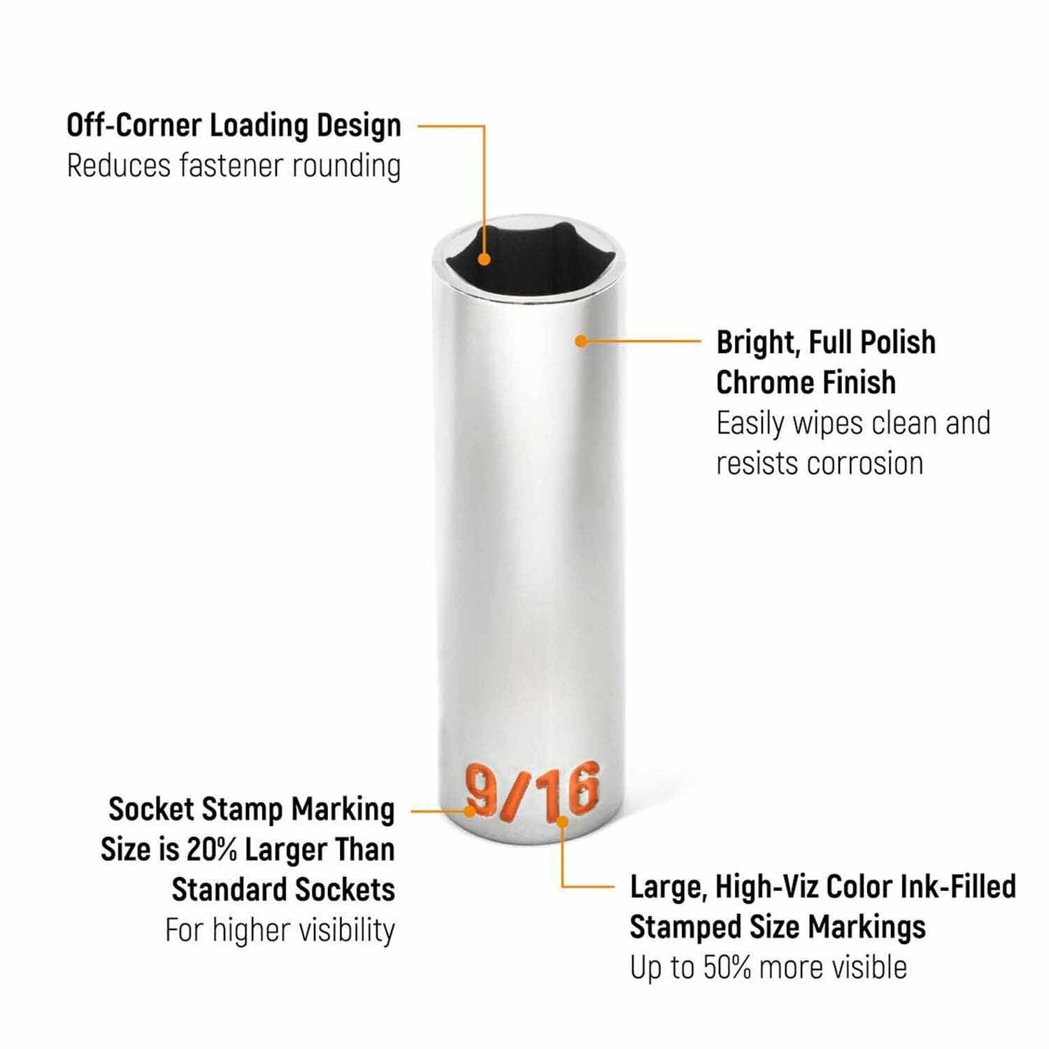 Hi-Viz deep socket set with large, color-filled size markings for superior visibility—up to 50% more visible and 20% larger than standard. Features off-corner loading to reduce fastener rounding, chamfered openings for quick alignment, and a bright full?polish chrome finish that resists corrosion. Includes socket rail.