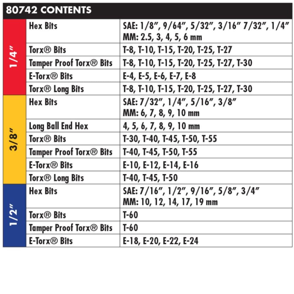 GearWrench 80742 84 Pc. 1/4", 3/8" & 1/2" Drive Hex/Ball End Hex/Tamper Proof Torx/External Torx/Torx SAE/Metric Bit Set