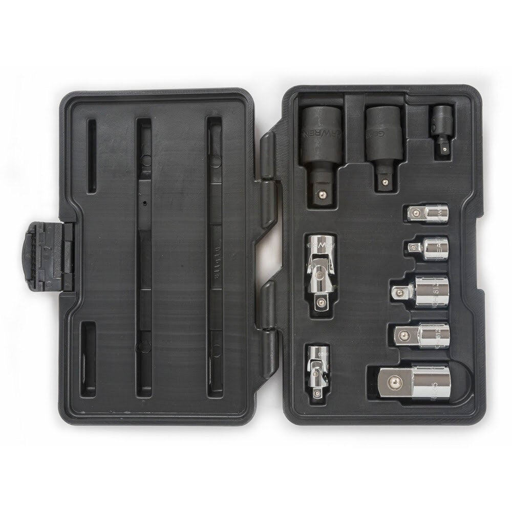 GEARWRENCH drive tool accessories help complete any job with speed, efficiency, and access. The standard drive tools are made from premium alloy steel and have a full polish chrome finish. While the impact drive tools are made from chrome molybdenum alloy steel with a corrosion resistant coating. The 81205 is a 10 piece set featuring 1/4 in., 3/8 in., and 1/2 in. drive impact universal joints, 1/4 in. and 3/8 in. drive chrome universal joints, 3 increasing adapters, and 2 decreasing adapters. The set is furnished in a blow mold case for storage and organization.