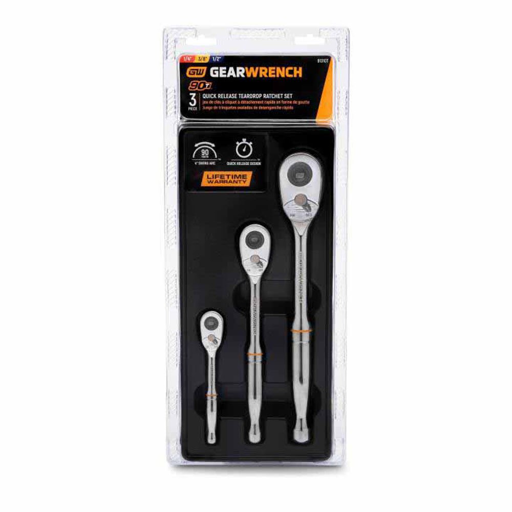GearWrench 81310T 3 Pc. 1/4", 3/8" and 1/2" Drive 90-Tooth Quick Release Teardrop Ratchet Set