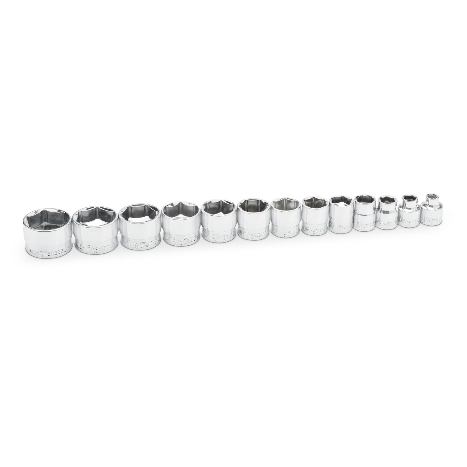 - (1 Each) 1/4 in, 5/16in, 3/8in, 7/16in, 1/2in, 9/16in, 5/8in, 11/16in, 3/4in, 13/16in, 7/8in, 15/16in, 1 in