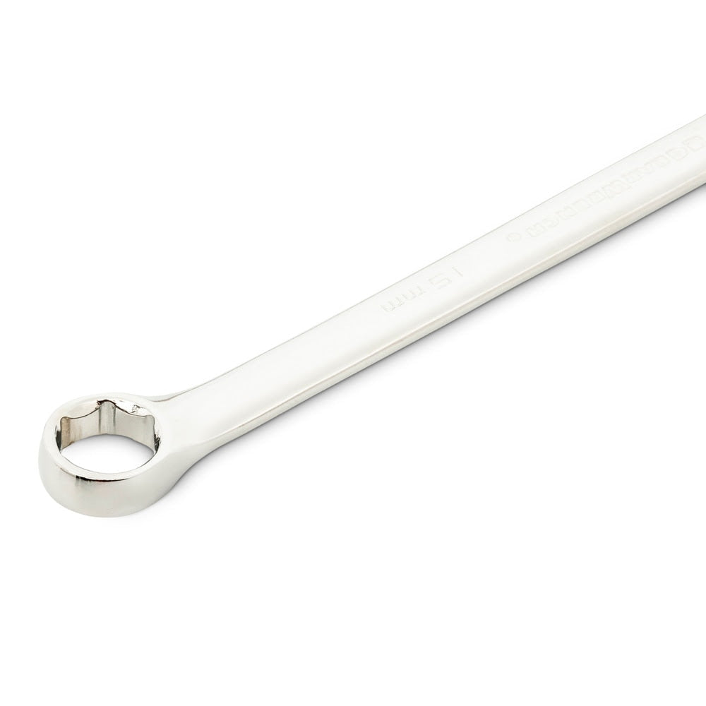The GEARWRENCH combination wrenches are a durable, made from alloy steel with a bright, full polish finish. The off-corner loading design on both ends provides a stronger grip on fasteners, reduces fastener rounding, and delivers up to 25% more torque to the fasteners. Sizes are stamped on the open end head, as well as the beam for quick and easy identification. The box end is offset 15° for increased access to fasteners. The 81924 is a 14 piece 12 point, metric standard length set including sizes 6 mm to 19 mm.