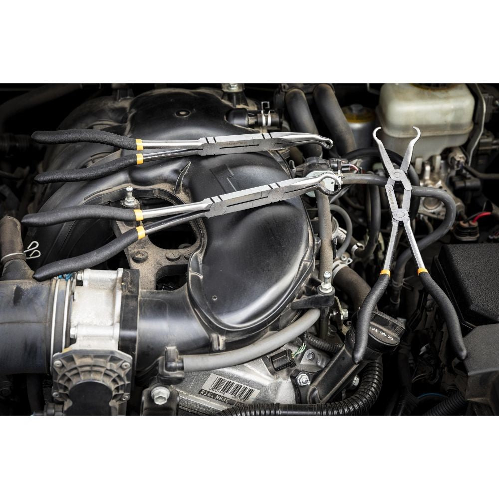GEARWRENCH Double-X pliers are ideal for extremely confined spaces because of their compound joint that allows access with minimal handle movement and their narrow profiles. They also offer maximum reach without exceeding the center point of interference. The jaws open wider than the handle for added reach in confined work areas. Double-X pliers are available in a variety of styles, including: straight nose, bent nose, hose grip, internal and external snap ring, and both straight and bent hemostat.