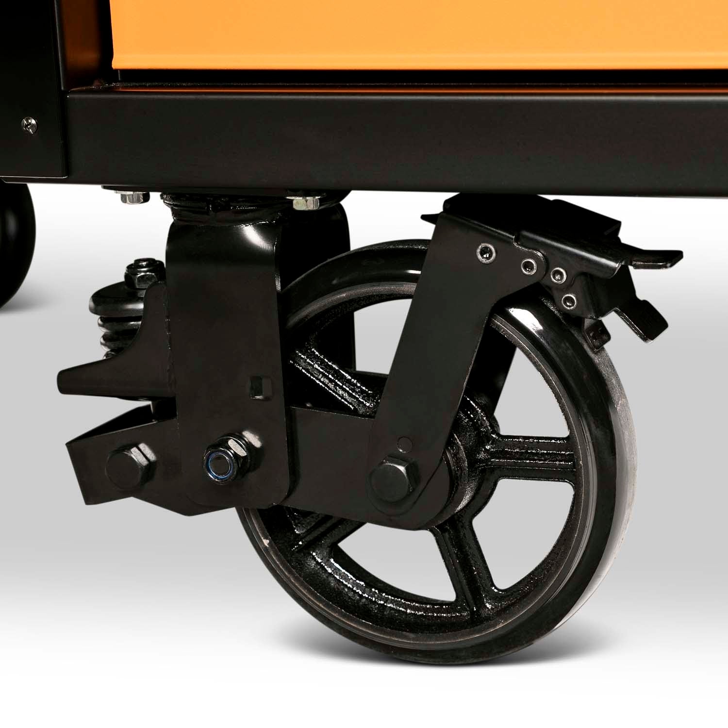 - Four heavy-duty 8 in. x 2 in. shock-absorbing polyurethane locking swivel casters