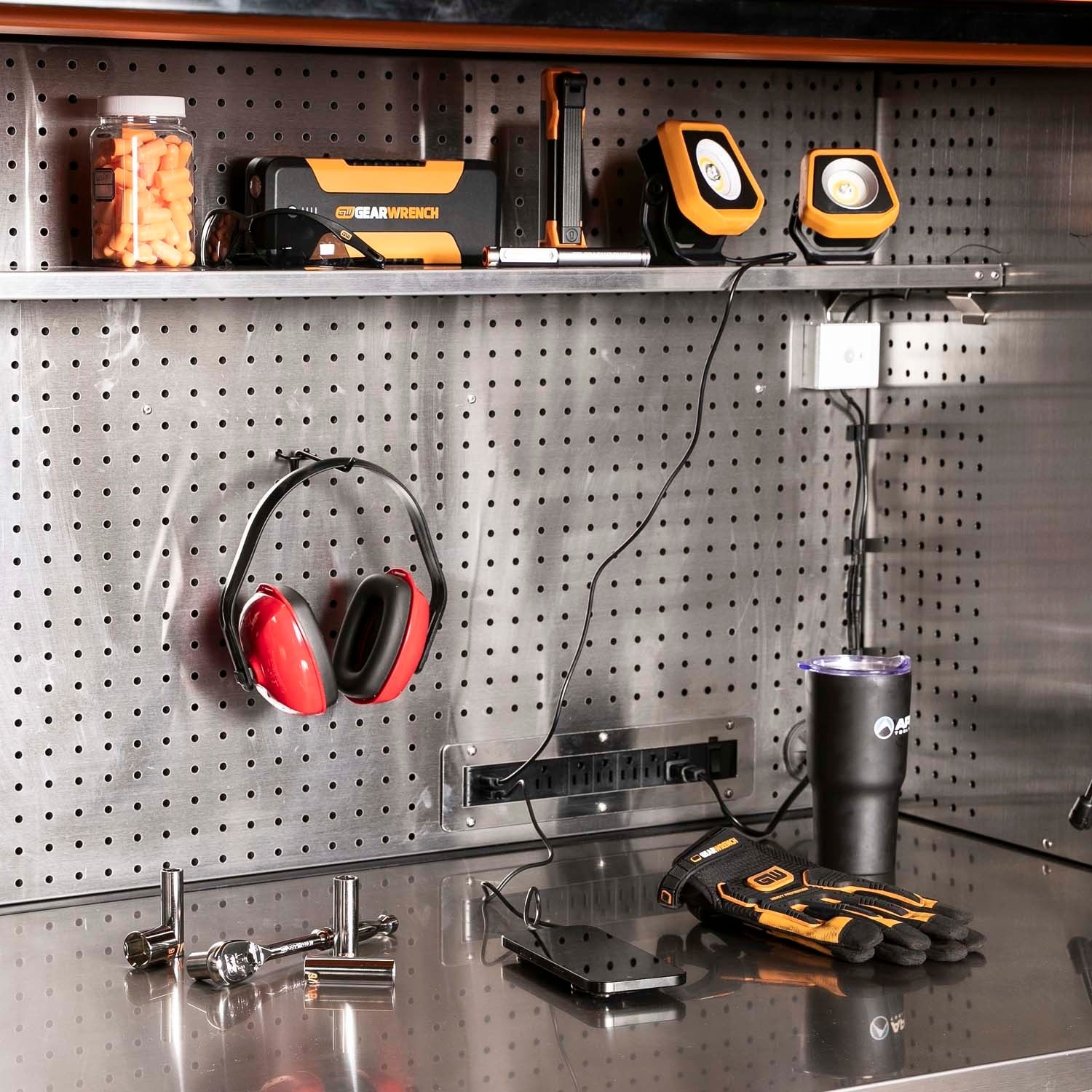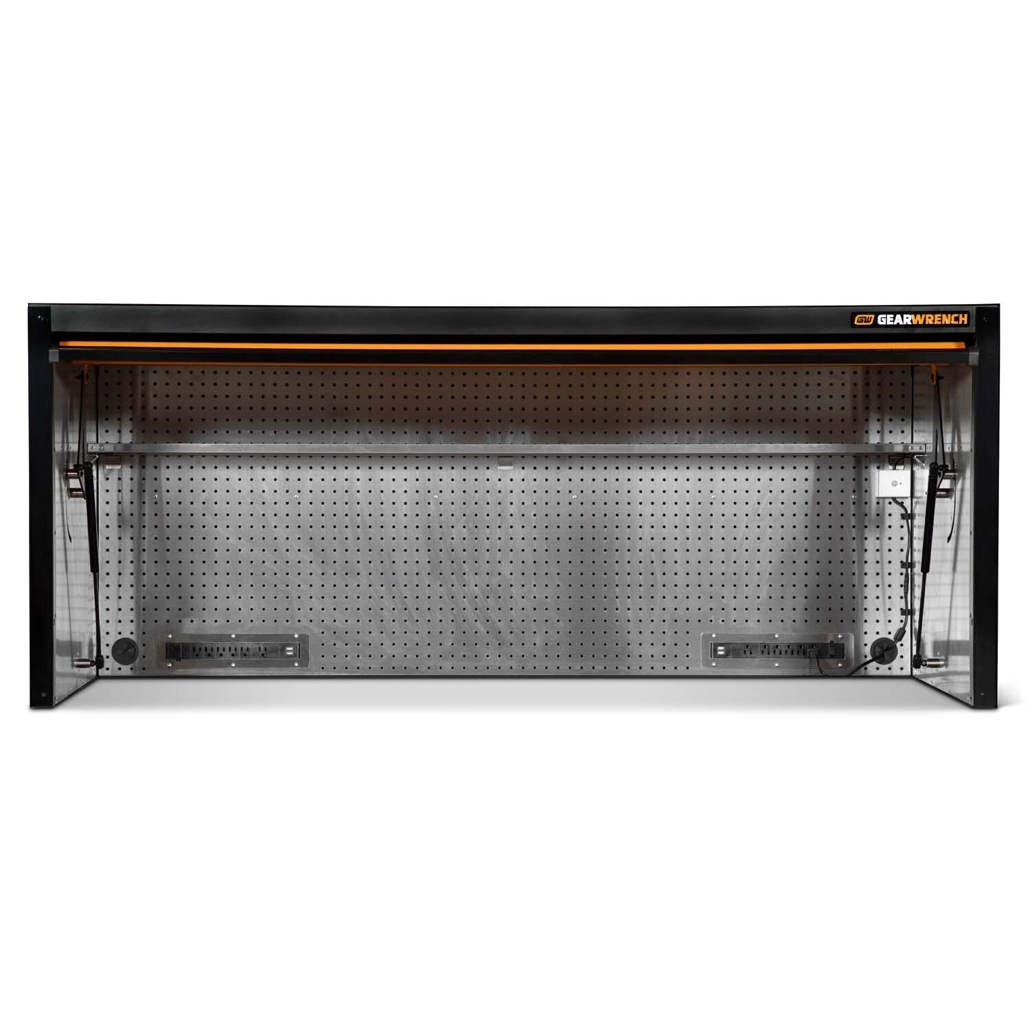 This 72 in x 30 in top mount hutch is built for the GearWrench 30 in deep professional mobile workbench storage system, featuring a heavy gauge steel body, stainless steel pegboard backwall, adjustable shelf, and a built-in 2000 lumen LED light for organized, well-lit tool storage.