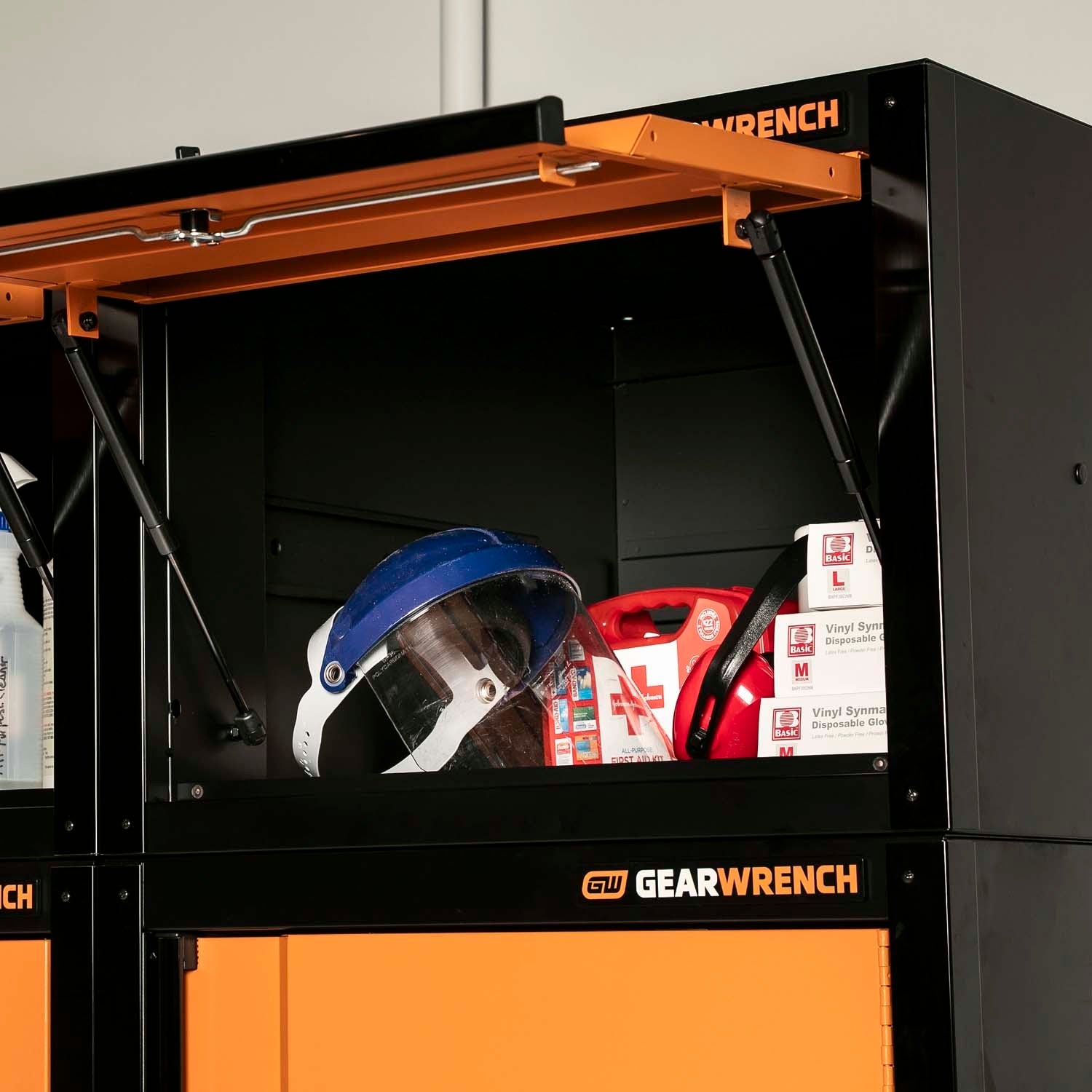 The GearWrench 83238STL small top locker adds secure, heavy duty storage to the 72 in. wide x 30 in. deep 83238 Professional Mobile Workbench System. Built from 16 gauge steel with smooth opening gas struts and a tubular lock and key, it mounts to the top of the 83238SL tall side locker (sold separately) and is compatible with other 83238 series accessories.