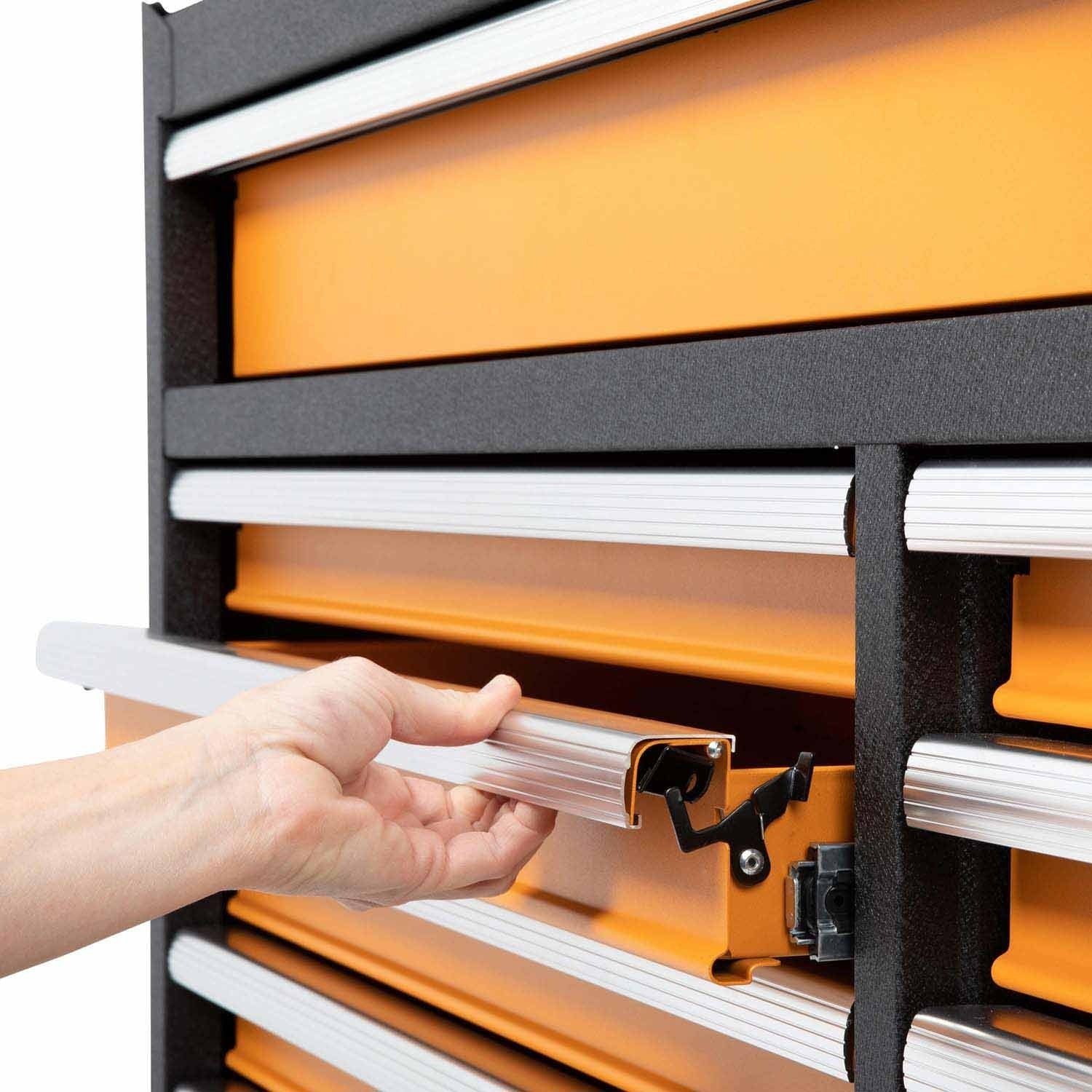 - Auto return sliding drawers with 100 lb capacity ball bearing slides; 3 drawers with double slides for 200 lb load capacity