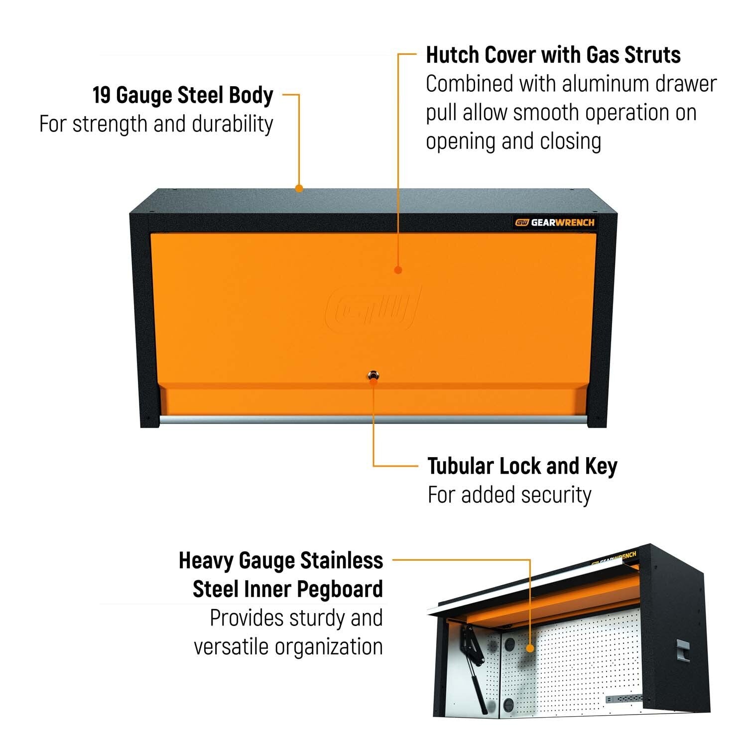 The GearWrench 83247HTC 52 inch top mount hutch adds secure, heavy duty organization to your rolling tool cabinet setup with a stainless steel inner pegboard, gas strut assisted cover, and built in power for charging and corded tools.