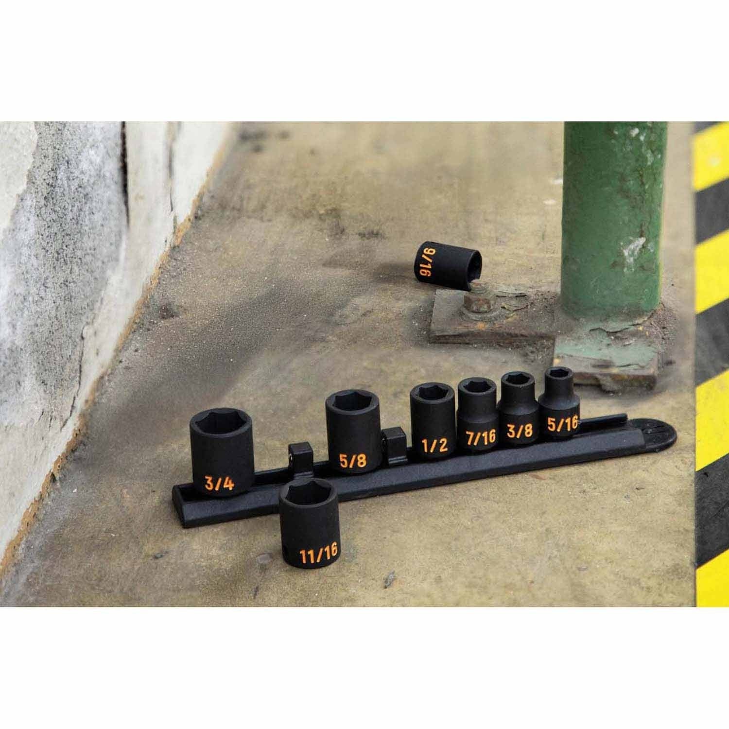 High-visibility 8-piece impact socket set made from durable Cr-Mo steel with large ink-filled size markings for quick identification, off-corner loading to reduce fastener rounding, and an industrial black finish; meets or exceeds ASME specifications and includes a socket rail.