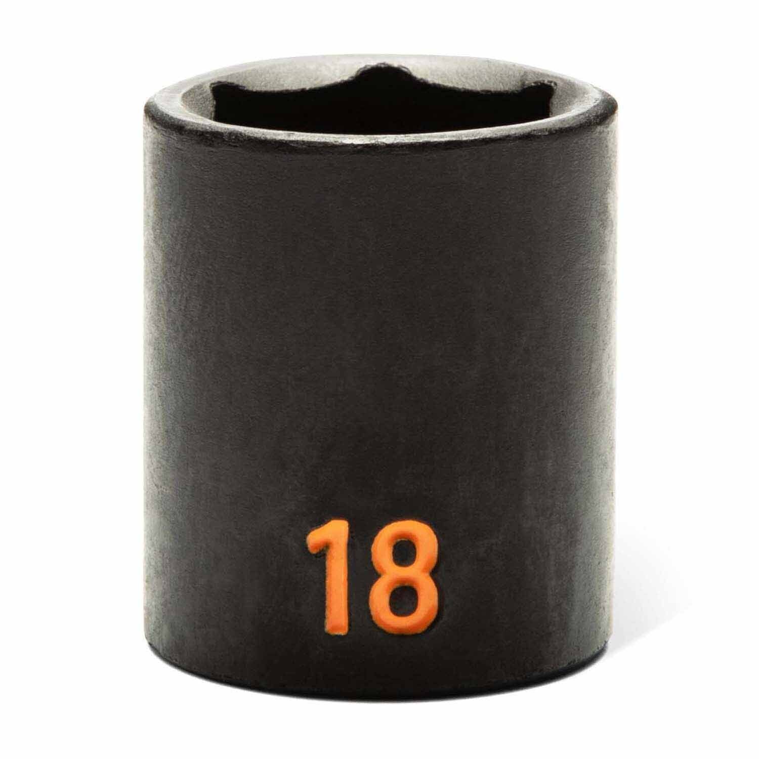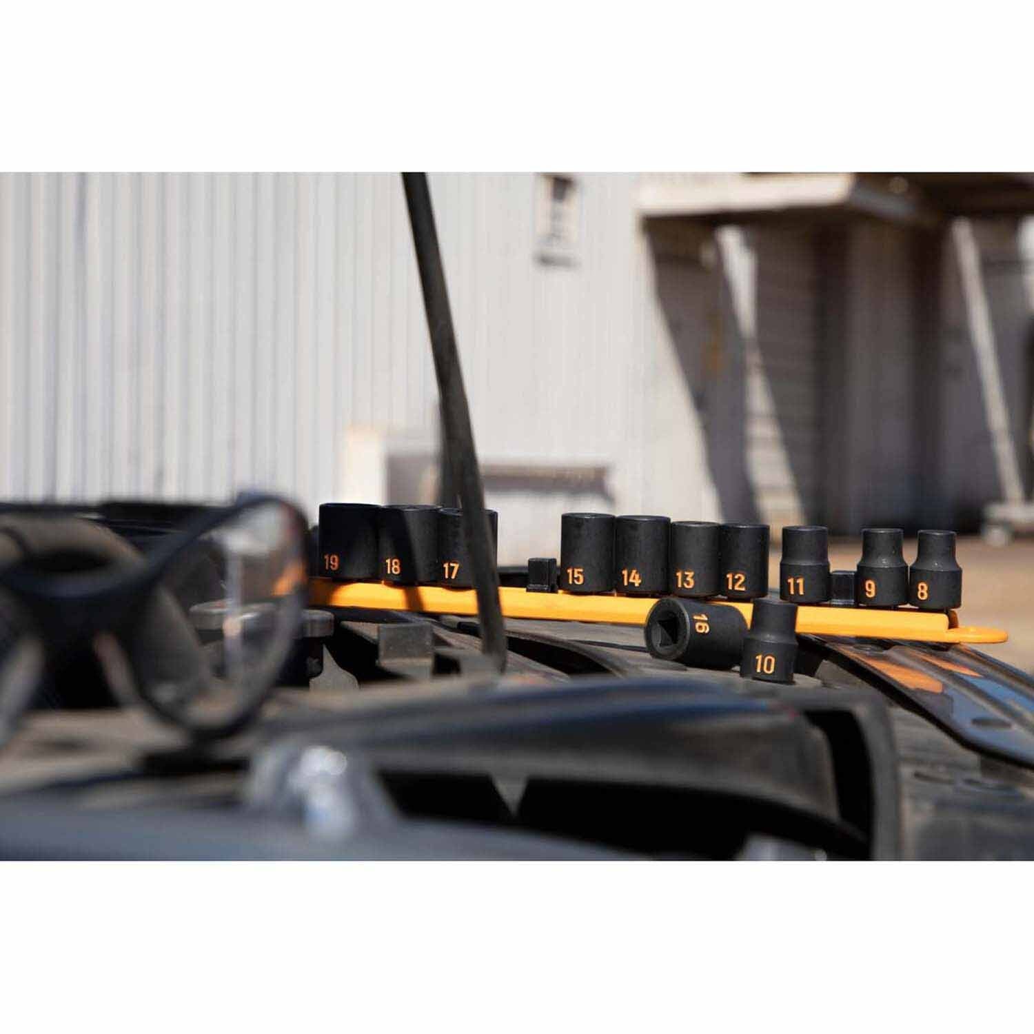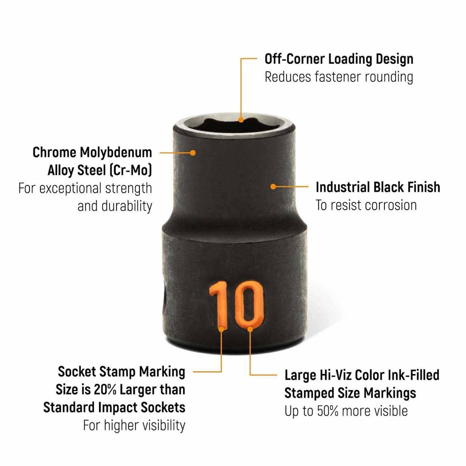 High-visibility 12-piece metric impact socket set built from durable chrome molybdenum (Cr-Mo) steel. Features large ink-filled size markings for quick identification, off-corner loading to reduce fastener rounding, and an industrial black finish. Meets or exceeds ASME specifications and includes a socket rail for organized storage.