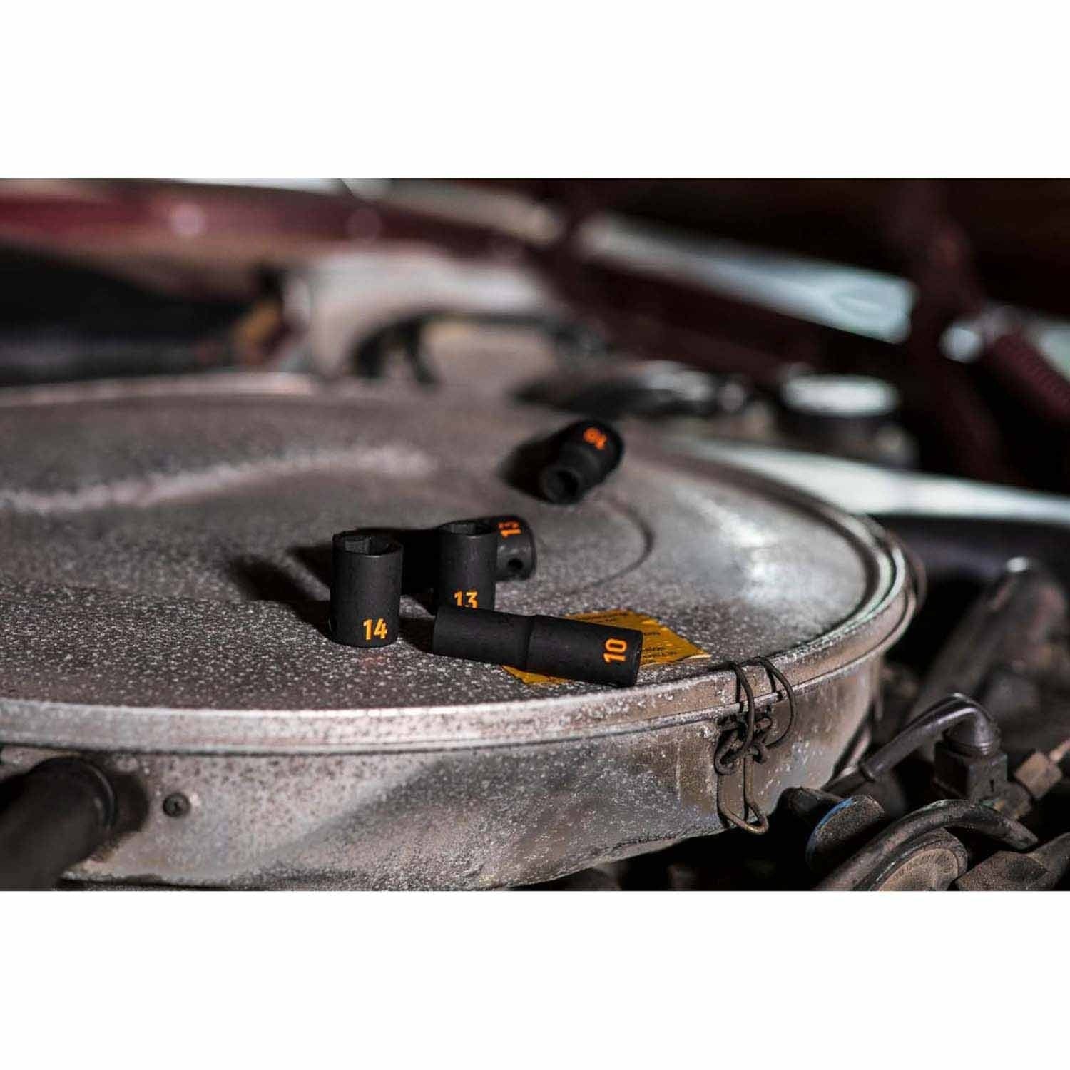 - (44) Impact Sockets, Deep: 5/16 in, 3/8 in, 7/16 in, 1/2 in, 9/16 in, 5/8 in, 11/16 in, 3/4 in, 8mm, 9mm, 10mm, 11mm, 12mm, 13mm, 14mm, 15mm, 16mm, 17mm, 18mm, 19mm, 21mm