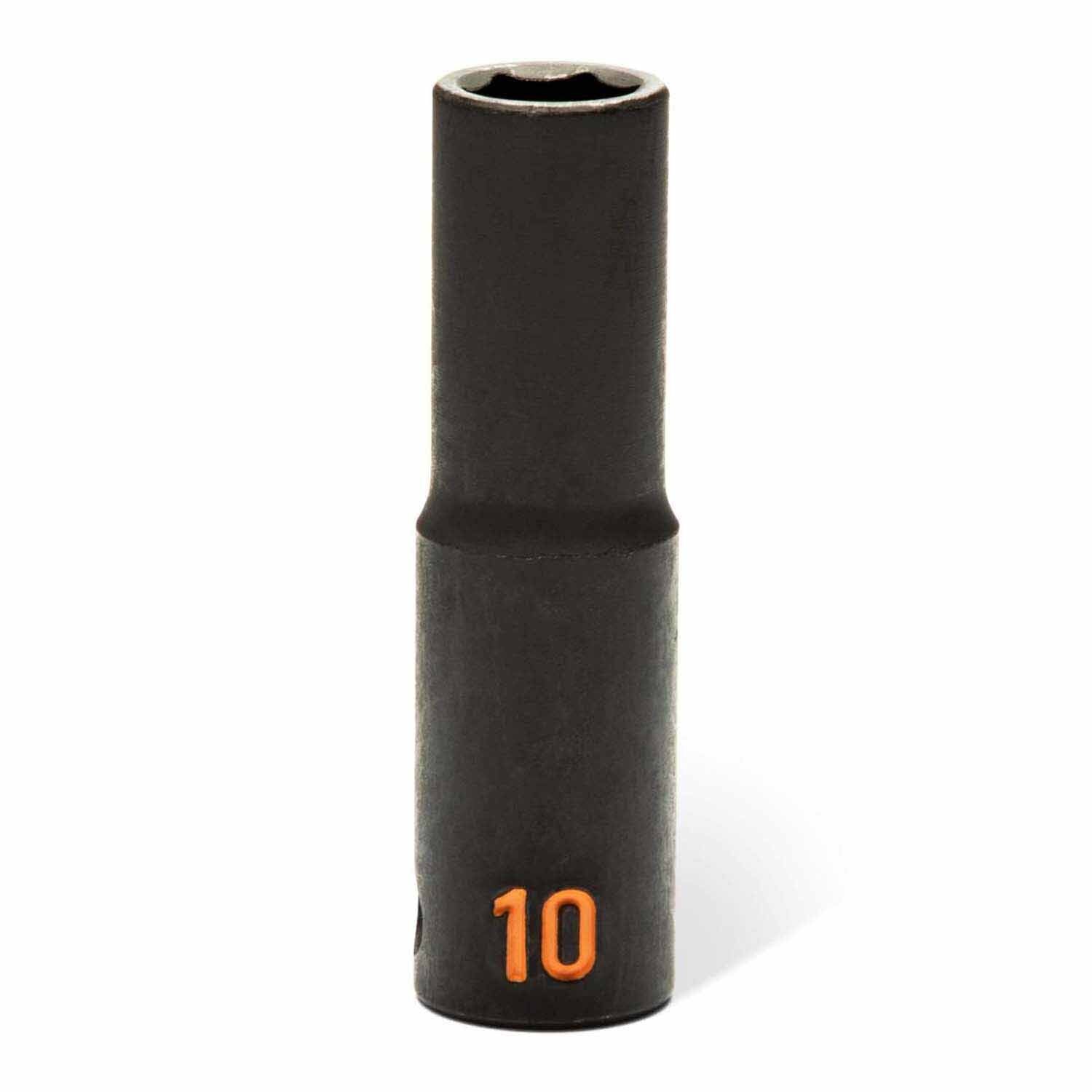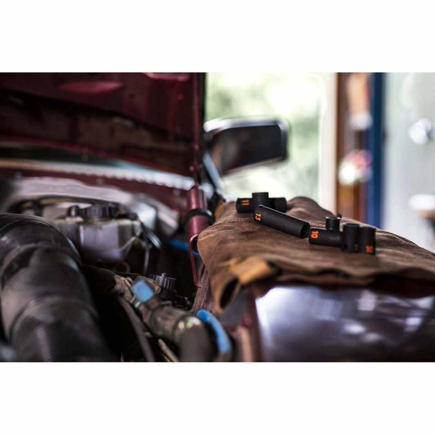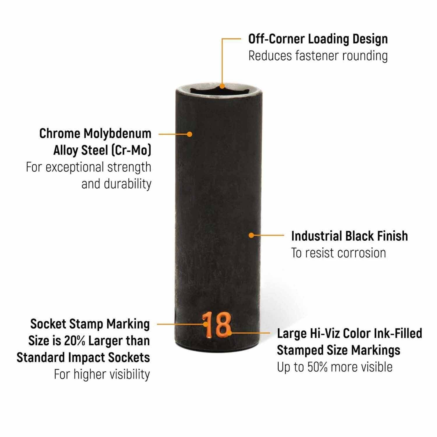 High-performance impact socket set made from chrome molybdenum alloy steel (Cr-Mo) for strength and durability. Large Hi-Viz ink-filled size markings are up to 50% more visible with 20% larger stamping for quick identification. Off-corner loading reduces fastener rounding, and the industrial black finish resists corrosion. Meets or exceeds ASME specifications.