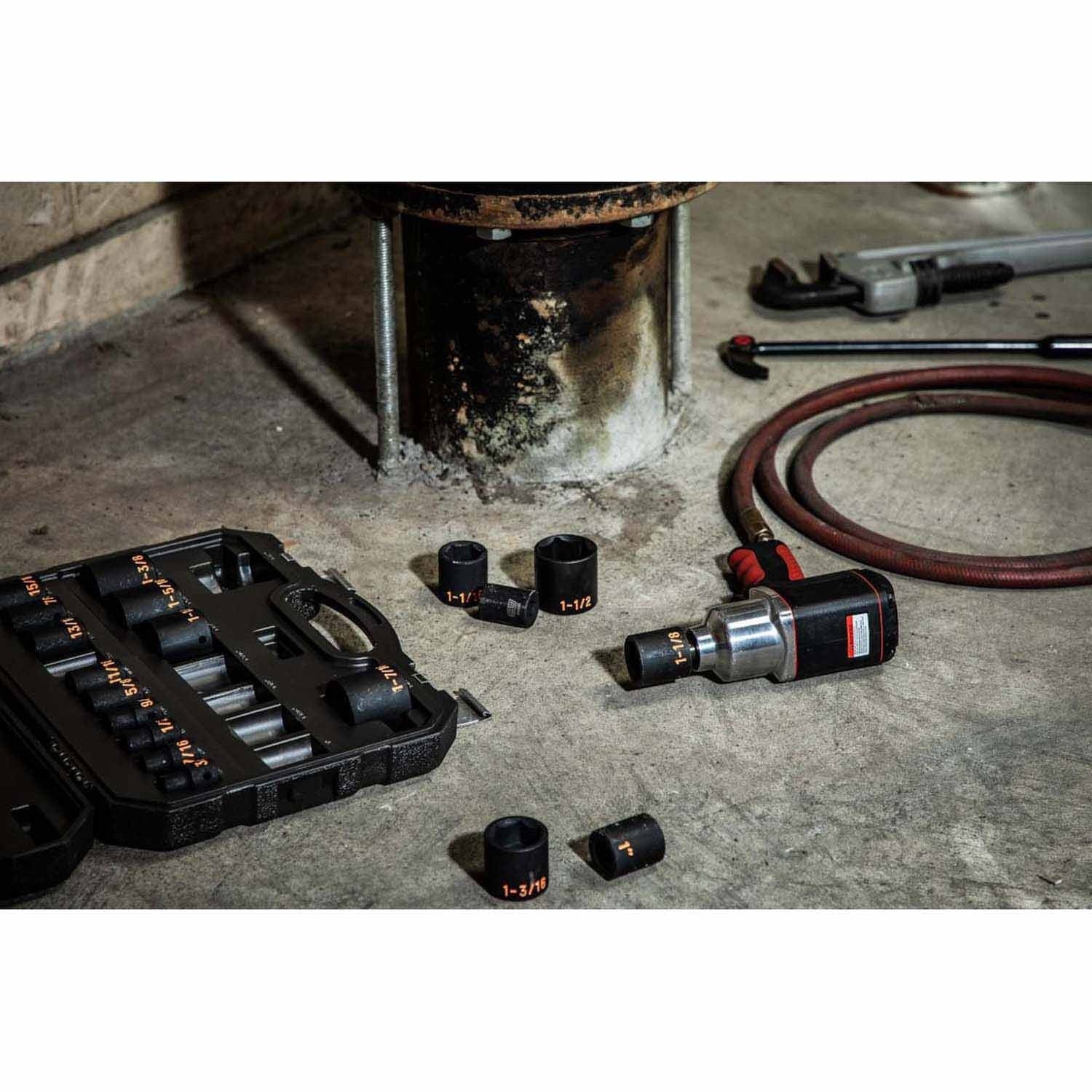 - (19) 1/2 in. Drive SAE 6-Point Impact Sockets: 7/16 in, 1/2 in, 9/16 in, 5/8 in, 11/16 in, 3/4 in, 13/16 in, 7/8 in, 15/16 in, 1 in, 1-1/16 in, 1-1/8 in, 1-3/16 in, 1-1/4 in, 1-5/16 in, 1-3/8 in, 1-7/16 in, 1-1/2 in