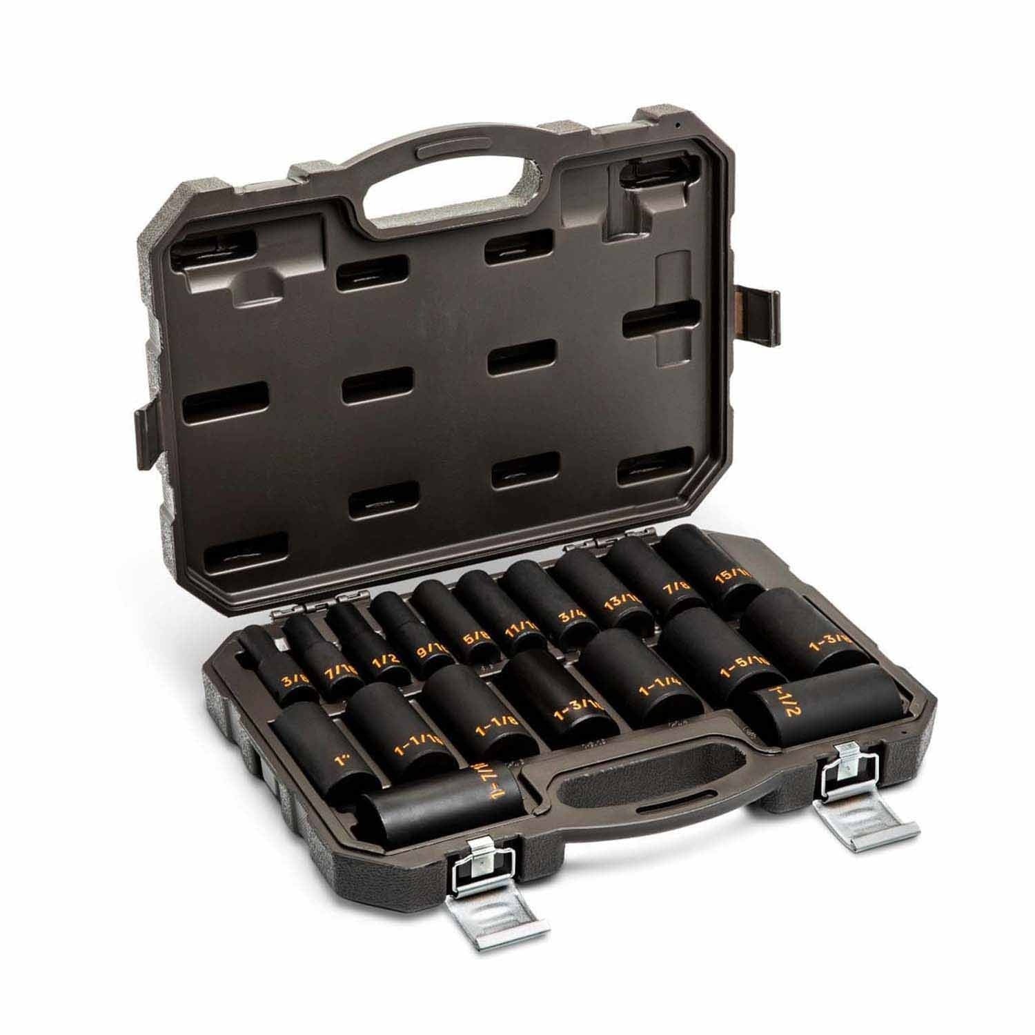 - (19) Deep Impact Sockets: 3/8 in, 7/16 in, 1/2 in, 9/16 in, 5/8 in, 11/16 in, 3/4 in, 13/16 in, 7/8 in, 15/16 in, 1 in, 1-1/16 in, 1-1/8 in, 1-3/16 in, 1-1/4 in, 1-5/16 in, 1-3/8 in, 1-7/16 in, 1-1/2 in