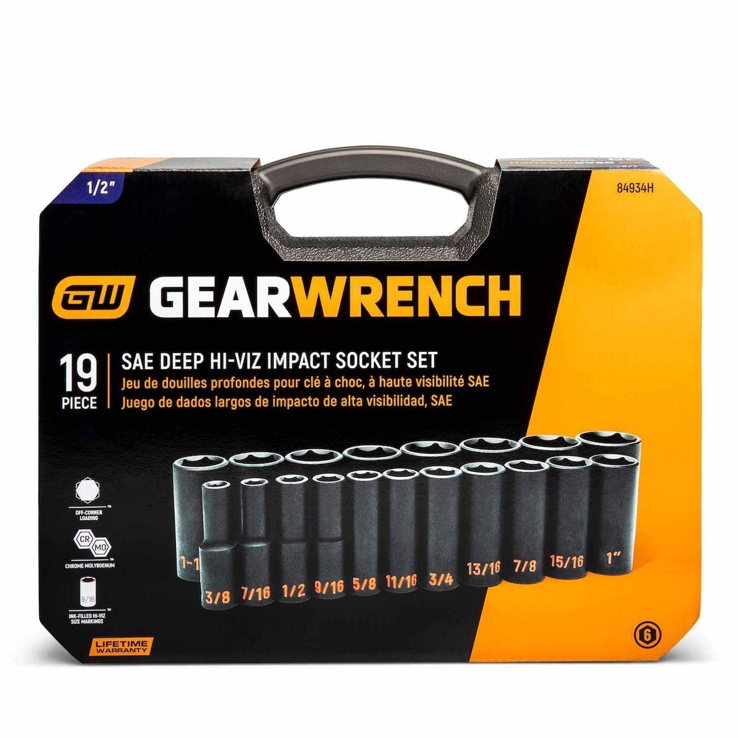 GearWrench 84934H 19 Piece 1/2" Drive 6 Point SAE Hi-Viz Deep Impact Socket Set