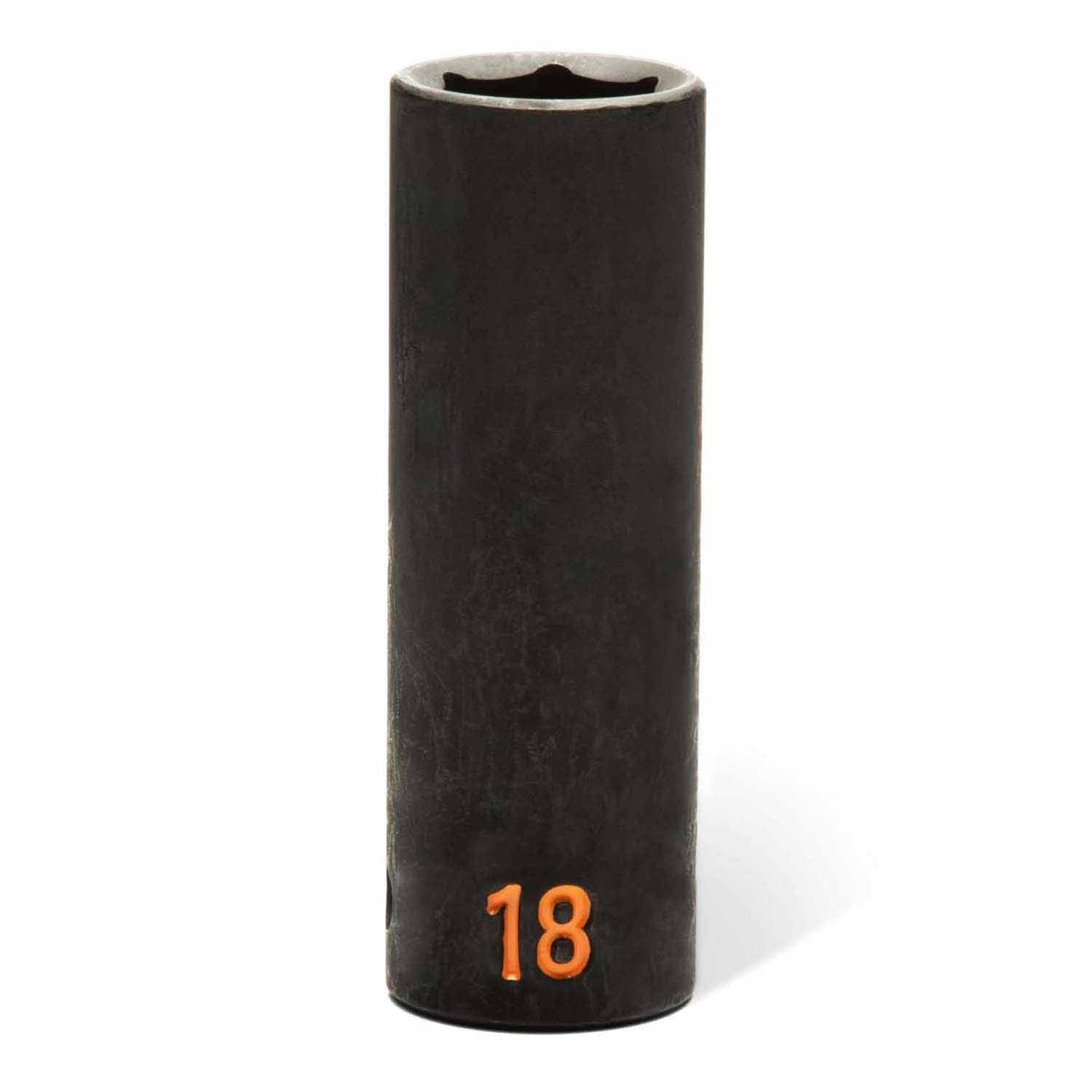 High-performance impact socket set made from chrome molybdenum alloy steel for strength and durability. Hi-Viz ink-filled size markings are up to 50% more visible with 20% larger stamp size for quick identification. Off-corner loading reduces fastener rounding, and the industrial black finish resists corrosion. Meets or exceeds ASME specifications.