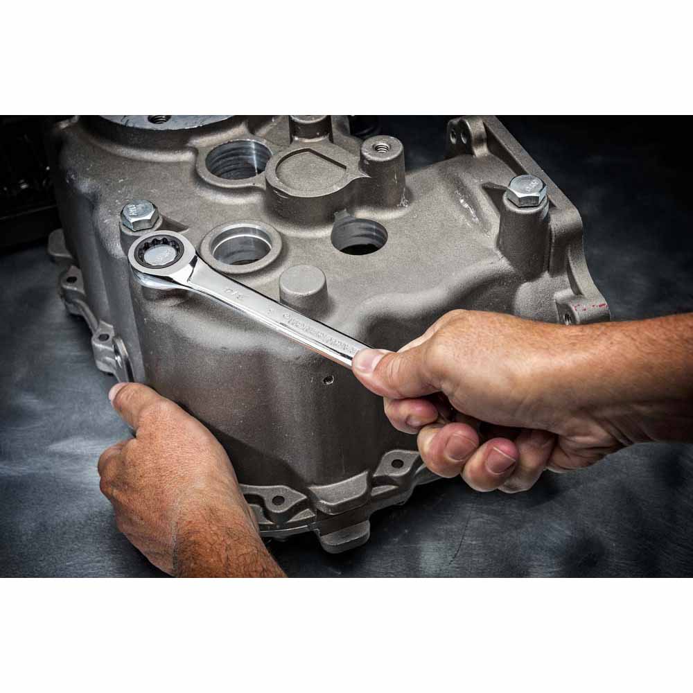 The GEARWRENCH ratcheting combination wrenches are the original patented ratcheting wrench! The ratcheting box end is designed to need as little as 5° to move fasteners versus 30° for standard wrenches. The wrenches are made from strong alloy steel with a bright, full polish chrome finish. The ratcheting box end features off-corner loading for a better grip on the fastener and reduces fastener rounding. The stubby length allows greater access to tight areas.