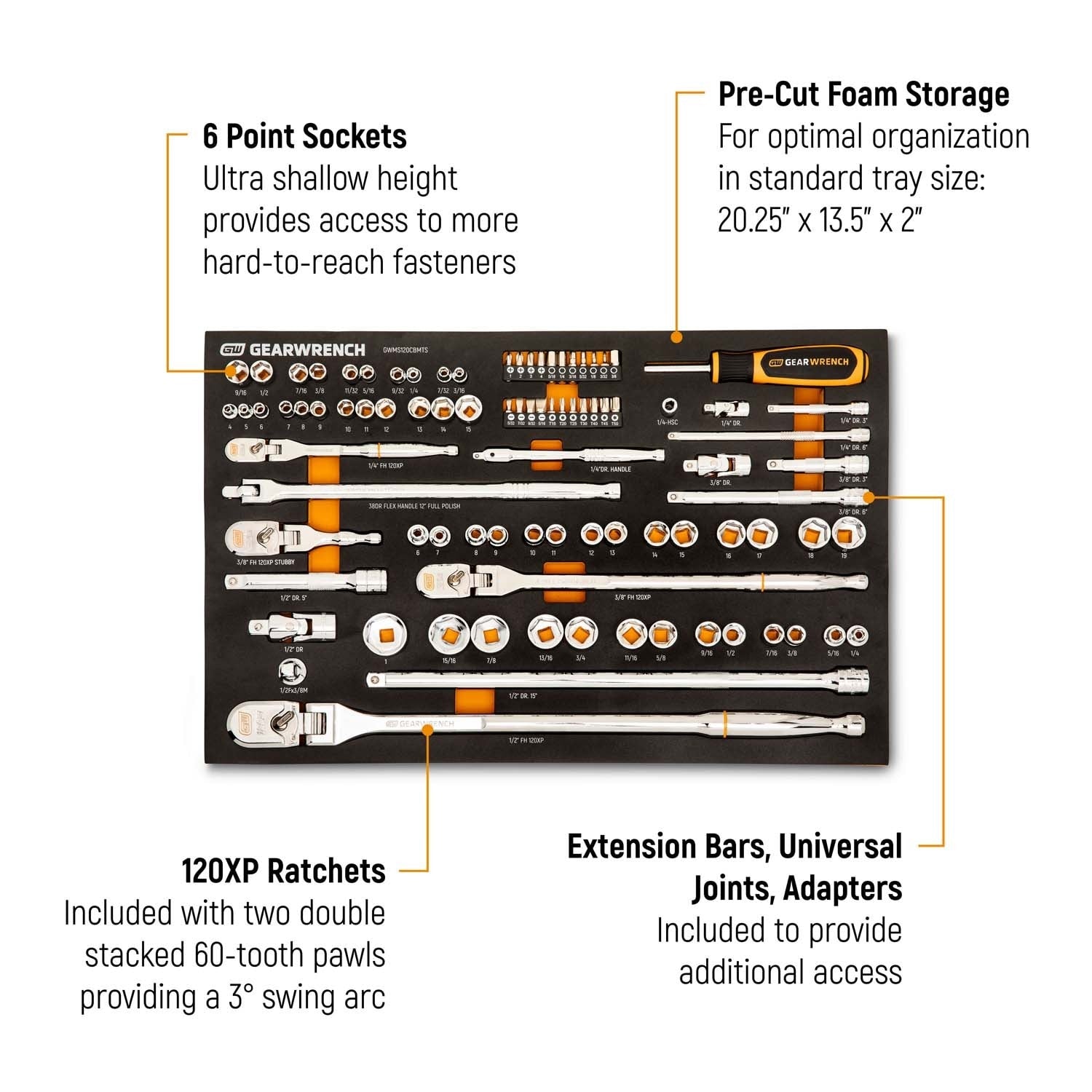 The GearWrench GWMS120CBMTS modular mechanics tool set is built for professional access and productivity, featuring 120XP next generation flex head ratchets, 6 point low profile sockets, and a magnetic bit holding screwdriver with common bits, all organized in a premium precut foam storage tray for fast identification and protection.