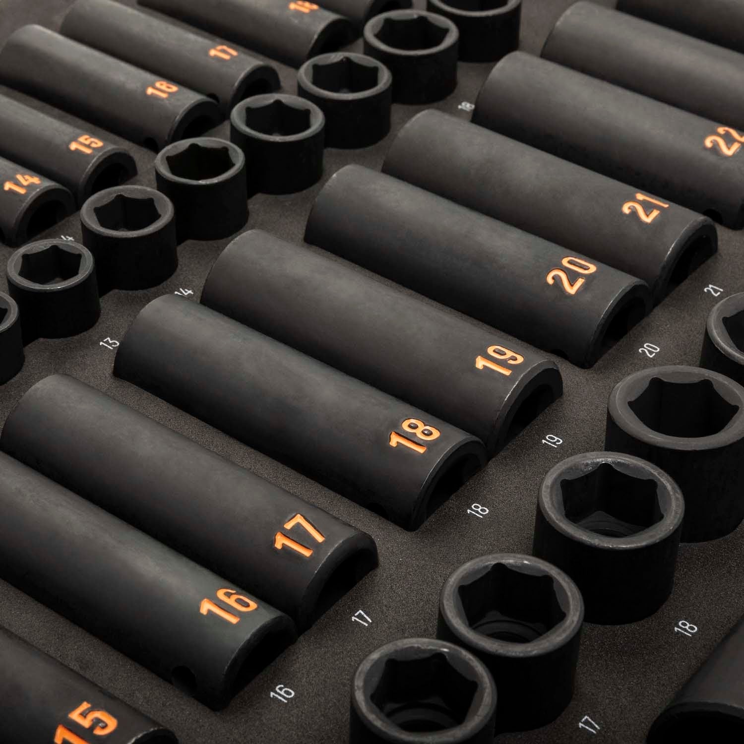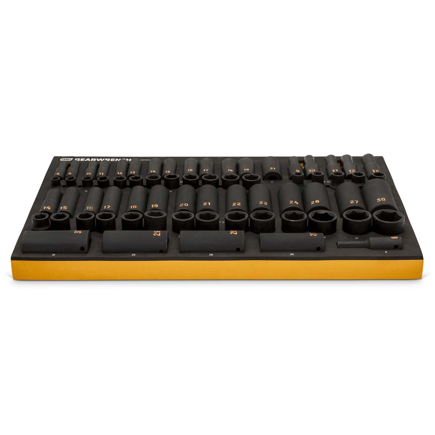 This 68 piece GearWrench metric impact socket modular set includes standard and deep 6 point sockets for 3/8 in and 1/2 in drive tools, organized in a chemical and solvent resistant hi-viz foam storage tray for fast identification, protection, and accessibility.