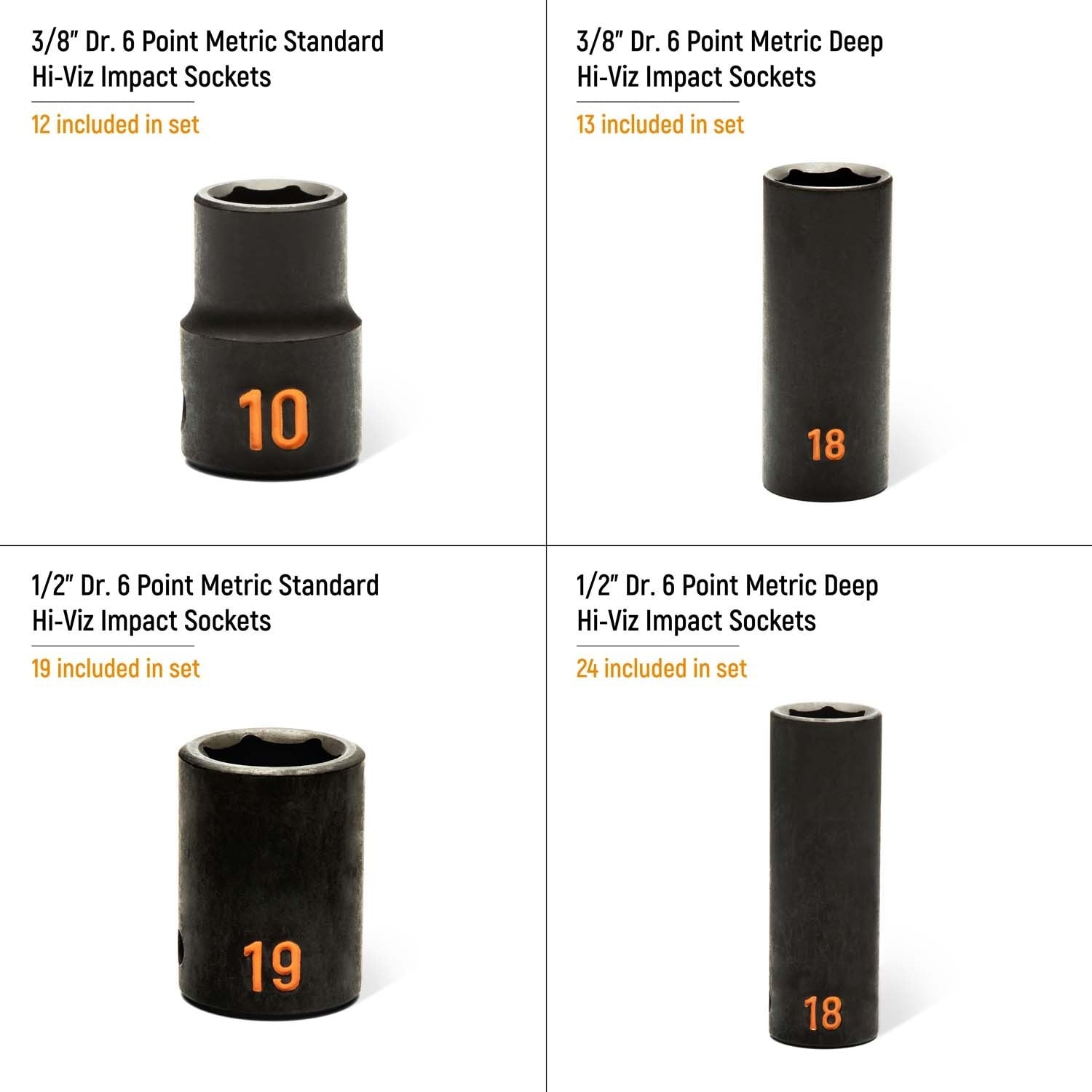 - Metric impact socket set for 3/8 in and 1/2 in drive sizes