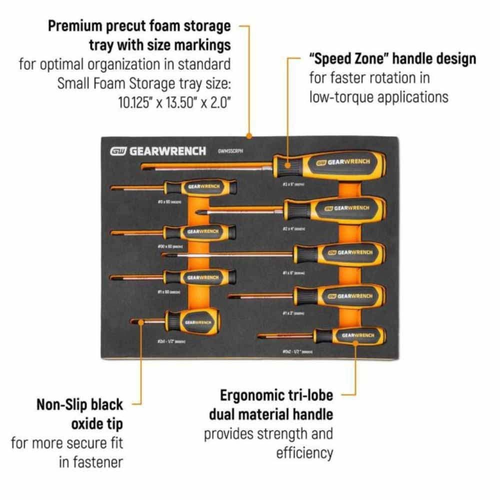 GEARWRENCH mechanics tools have been designed with professional users in mind for better productivity, access, and strength. The 9 piece Phillips® dual material screwdriver set in a foam storage tray is one of the wide collection of GEARWRENCH Modular Sets. These chemical and solvent resistant foam trays are designed to fit in a wide range of tool storage systems, including our GSX storage line of products. The foams are in contrasting orange and black with high visibility size markings for easy tool identification. Each of the tools fits in a custom cutout that provides optimal protection, organization, and accessibility.