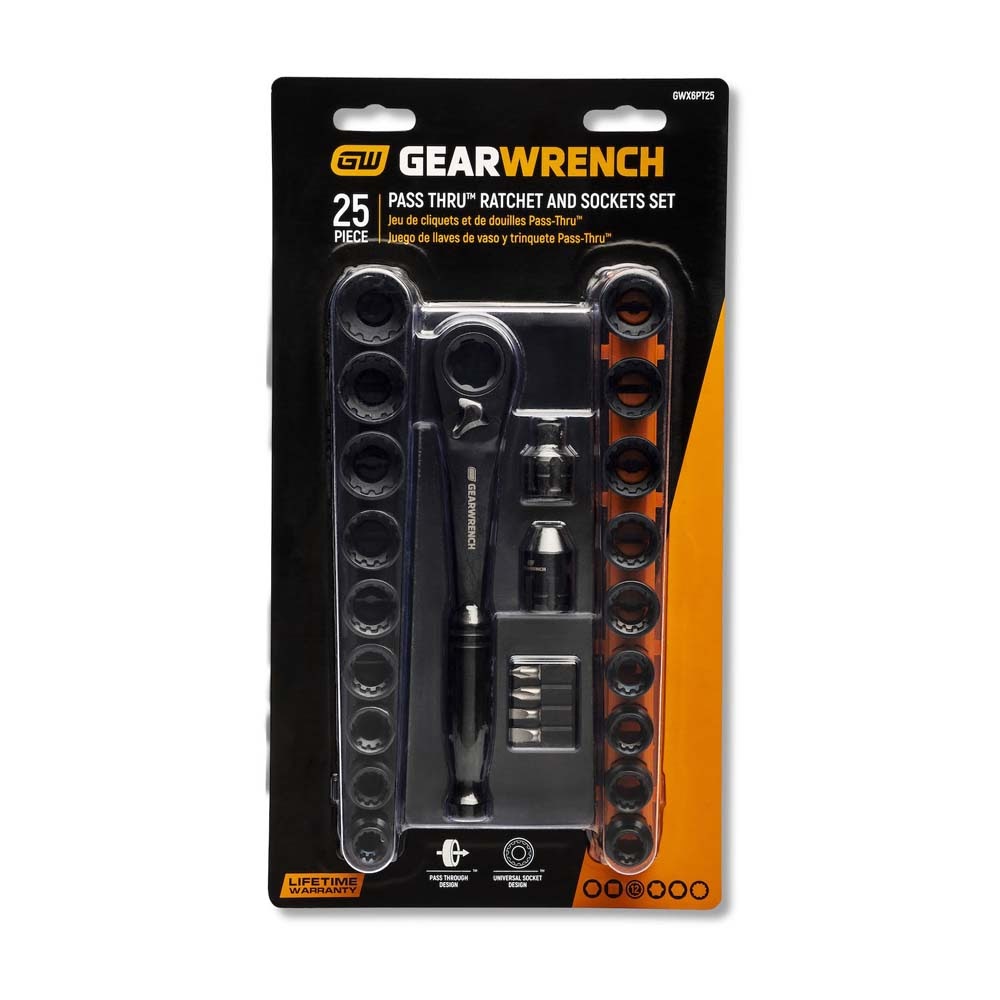 GEARWRENCH mechanics tools have been designed with the professional user in mind for better productivity, access, and strength. GWX6PT25 is a 25 piece versatile Pass-Thru Ratchet and Socket set that offers a variety of applications for users. Set comes with socket rails and bit holder for storage and organization.