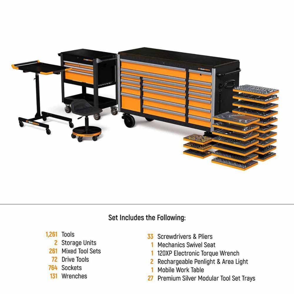 GEARWRENCH mechanics tools have been designed with professional users in mind for better productivity, access, and strength. We have taken a MEGA step further to provide our users the ultimate customer experience with our MEGAMOD1268 set. The master set has been thoughtfully curated to include the right tools for your job, organized in premium pre-cut foam, and paired with the perfect storage units, work lights, electronic torque wrench, and additional shop accessories.