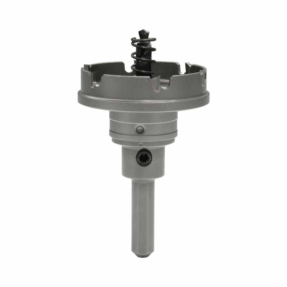 Quick Change Carbide Tipped Hole Cutter 2-3/8" (60.3 mm). Cuts stainless steel quickly and easily. Quick Change arbor allows you to change cutter heads with a simple push and a turn. Use the same arbor for different size cutting heads. Removable cutter heads available in sizes from 5/8" through 3". Flange stop prevents over-drilling. Ejector spring on all sizes above 3/4" makes removal of slug easier. Replaceable, cobalt-steel pilot drill with split-point tip to prevent walking. Precision carbide teeth for optimum performance and durability. Minimum chuck size of 3/8".