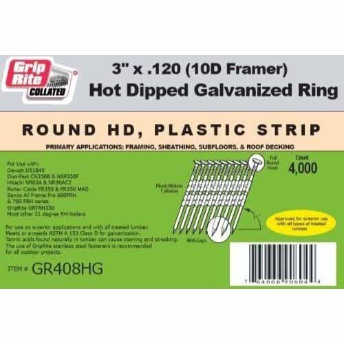 Grip-Rite GR408HG 3" X .120 Ring Shank Galvanized 21 Degree Gun Nail , 4/m
