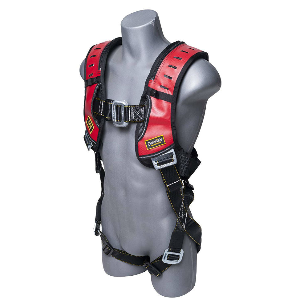 In 2007, the Guardian Fall Protection, “Edge Harness” received a Gold International Design Excellence Award and was recognized by Business Week magazine. In conjunction with a design team who has worked with Nike, Microsoft, Leupold & Steven, Guardian set out to design the safest and most versatile harness on the market. The padded shoulder, leg and back are made of closed cell foam with mesh lining that allows the material to breathe and trap sweat. Convenient slots offer workers a place to clip their radio, flashlight, pager, cell phone, or Hydrapak straw. This adjustment area allows 4” of chest strap adjustment. All Edge Series harnesses feature a “Quick-Connect” friction torso buckle with a release tab. Positioning D-rings are backed with heavy duty cordura and a wear pad to increase durability. Our innovative tool belt features a slide-on strap that can be completely removed in a fall situation to relieve some of the weight. Slide your own bags onto this lightweight application, or use your regular tool bag over this application. Special web keepers and sewing process keeps our webbing secure to the harness. A back pad comfortably keeps the harness in a vest shape while still allowing for dorsal D-ring adjustment. Back pad includes an inside pocket that houses a cool-heat or hydration pack. XXL size is built specifically for individuals whose height ranges from 5’4” to 6’8” and whose weight ranges from 220 to 360 pounds.