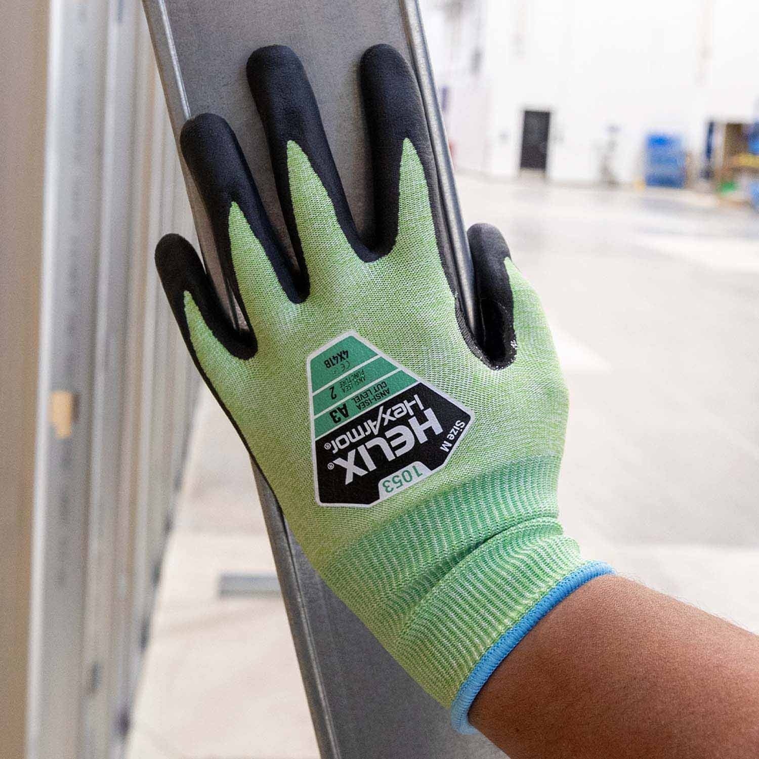 Helix 1053 gloves feature an 18-gauge HPPE/nylon blend shell with flexible foam nitrile palm coating for superior grip and abrasion resistance, offering high dexterity, touchscreen capability, and a skin-safe, breathable knit for general-purpose work.