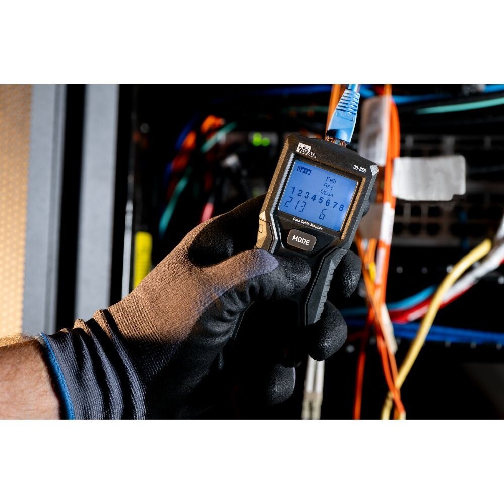 The 33-855 is a simplified, compact version of our popular 33-856 VDV tester, which is designed to test RJ45/8 conductor cables exclusively. The tester features a backlit LCD screen with a numeric display to identify the Pass/Fail status of the wire map test as well as a pin-by-pin display of opens, shorts, mis-wires, and split pairs. Single-button operation cycles through testing, toning, and device power options. A built-in analog tone generator has 3 user selectable tones which can be applied to the RJ45 port by pin, by pair, or all conductors. This is used to help locate and identify a single cable that is within a bundle of cables. The tone generator has the ability to tone by pin, by pair, or by all conductors at once. This allows the user to more precisely locate errors within the cable, such as finding opens. The 62-164 or 62-144 Amplifier probe (sold separately) is recommended for use in amplifying the tone signal. 2 AAA 1.5V batteries are included.
