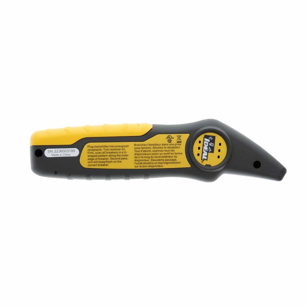 The IDEAL 61-535 is a 120V AC Circuit Breaker Finder that automatically identifies a circuit breaker/fuse protecting a live branch circuit. It consists of a transmitter and a receiver. The Transmitter sends a signal over the conductors when connected to an energized circuit. It also identifies the presence of power and indicates corrector/incorrect wiring conditions via illuminated Green and Red LED’s and contains a GFCI Trip Tester. The receiver reads the transmitter’s signal and identifies the breaker/fuse energizing the circuit by illuminating a flashing green LED and emitting beeps once it determines the breaker/fuse with the strongest signal. The receiver also senses the presence of AC voltage (60 - 600 V AC) via and non-contact voltage (NCV) sensor in the tip. The receiver indicates the presence of AC voltage by illuminating a red flashing LED and emitting a beeping sound. The audible tone for both the breaker finding mode and the NCV mode can be muted via a button for working in noise sensitive areas. The receiver also includes a work light that can be operated independently for work in poorly lit conditions.