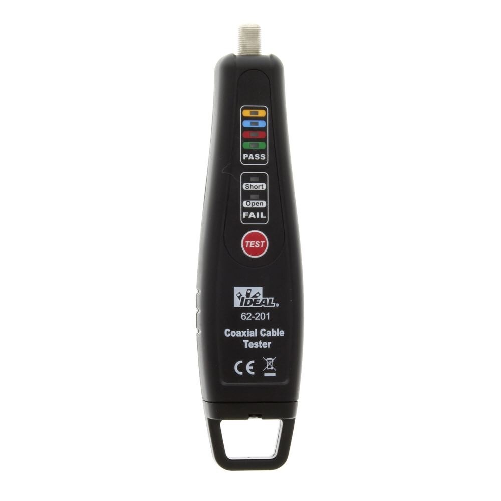 The 62-201 Coax Mapper Tester is used to verify the start and end point of a coaxial cable run. Designed for use on coax cables or wall plates terminated with F-type connectors, the tester can help homeowners, contractors, or maintenance professionals identify which coax lines go to which rooms and wall outlets in a residence or other building. Often used in applications involving splitters and taps, it simplifies finding the endpoint of a coax line when it is behind walls or travels through multiple floors of a building. The tester can also be used to verify coax patch cables have continuity and are free of termination and installation errors such as opens and shorts. Kit includes four color-coded remote terminators and one F-81 adapter that are stored on the back of the main test unit when not in use. These can be placed on wall plate outlets or terminated cable ends (may require additional F-81 adapters for terminated cables) that are suspected of being the other end of the cable. The main test unit attaches to the other end of the de-energized coax cable in question. When the test button is pressed, the PASS LED for the found colored remote will light up on the main test unit. Repeat this process until all cables and outlet locations have been mapped and identified. 2 AAA 1.5V batteries are included