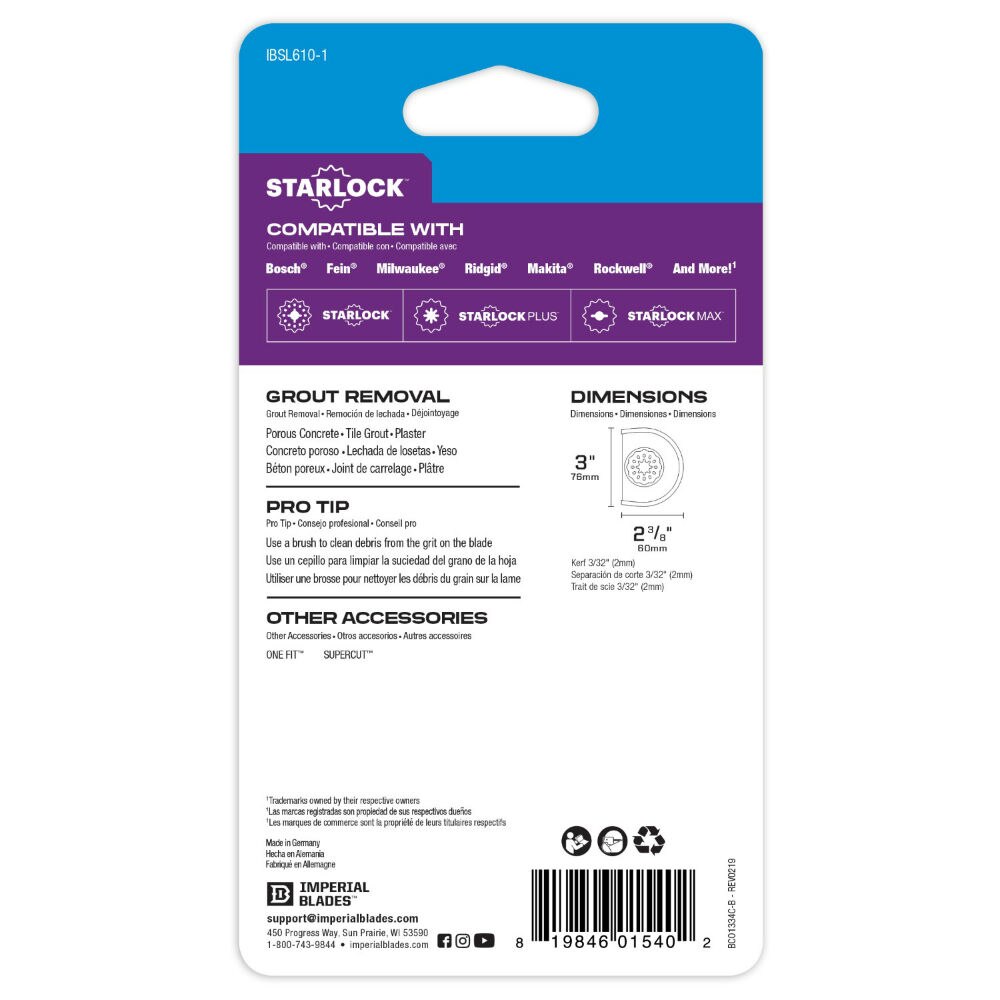 Imperial Blades' Starlock™ 3" Carbide Grit Segment Blade is coated with high performance carbide for aggressive material removal. Recommended applications are: Porous Concrete, Tile Grout, Plaster and more. Thin 3/32" kerf for removing grout without damaging surrounding tile. Segment blade shape is ideal for working in corners and on edges without over cut. Popular projects include cleaning and reworking planked deck joints, removal of tile grout and bath remodeling when replacing a shower valve. Compatible with Starlock™ multi-tools: Bosch and Fein. Also fits non-Starlock multi-tools: Milwaukee, Ridgid, Makita, Rockwell and more.