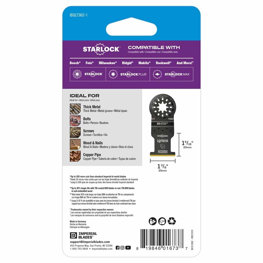 Imperial Blades Starlock™ 1-3/8" Carbide Extreme Storm Titanium Metal Blade is an extreme metal-cutting oscillating blade composed of durable bi-metal (BiM) combined with Storm Titanium coating for extended life and performance. The Carbide Extreme blade utilizes the carbide teeth to tackle the toughest applications and last up to 50X more cuts than standard Imperial bi-metal blades. Recommended applications are thick metal, bolts, screws, copper pipe, wood & nails, and more. Popular projects include deck maintenance, framing, hard material flooring, automotive or plumbing applications, and plaster. Compatible with all Starlock™ multi-tools including Bosch, Fein, Makita, Metabo, Festool, and Flex. This blade also fits non-Starlock™ Milwaukee multi-tools.