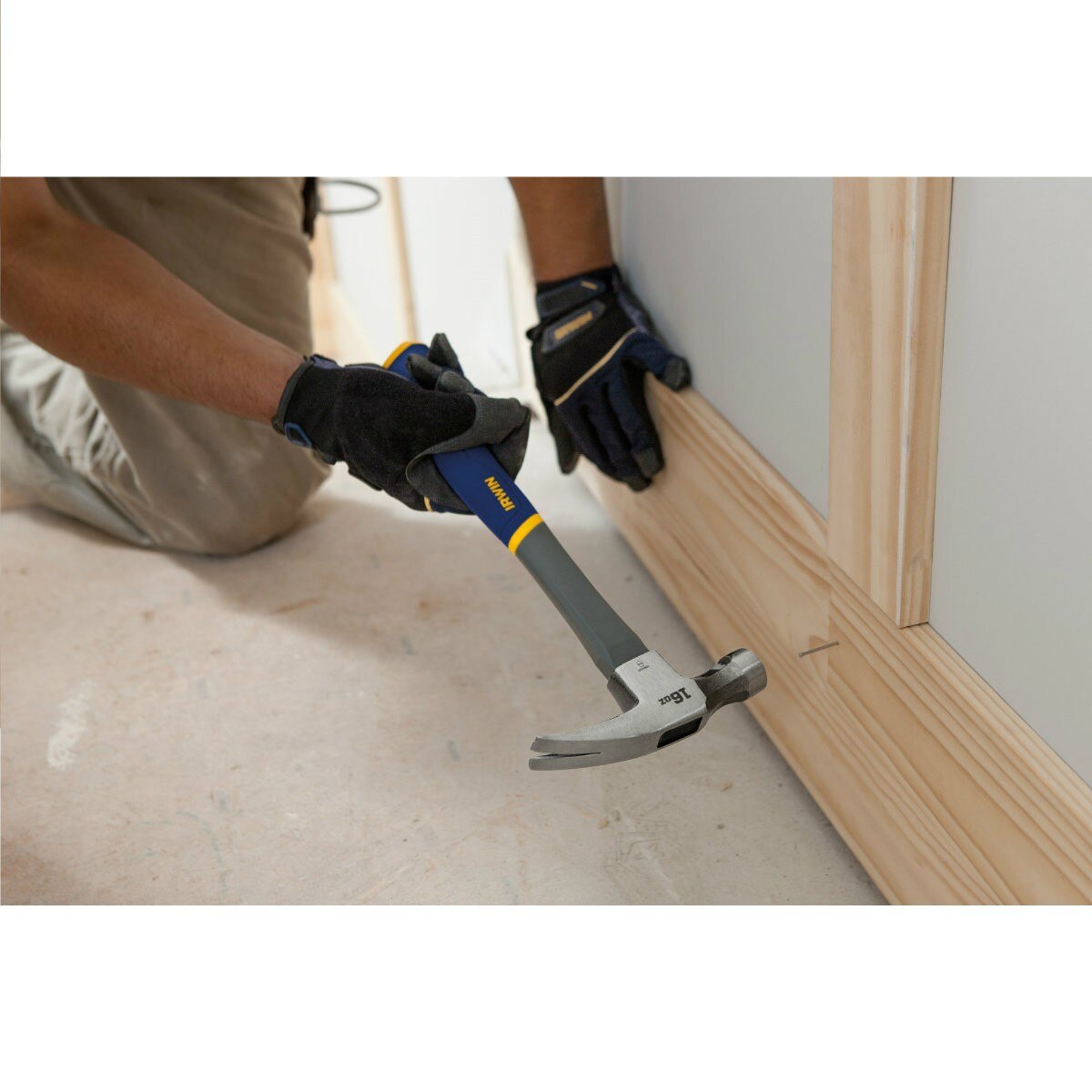 The Irwin 16 oz Fiberglass General Purpose Hammer combines a forged steel head on a fiberglass handle for lightweight durability. The handles rounded design offers unique curves and contours for optimal comfort and control. The smooth face prevents surface marks making it ideal for finish carpentry and interior work. The hammers fiberglass handle helps to absorb and reduce the effects of vibration.