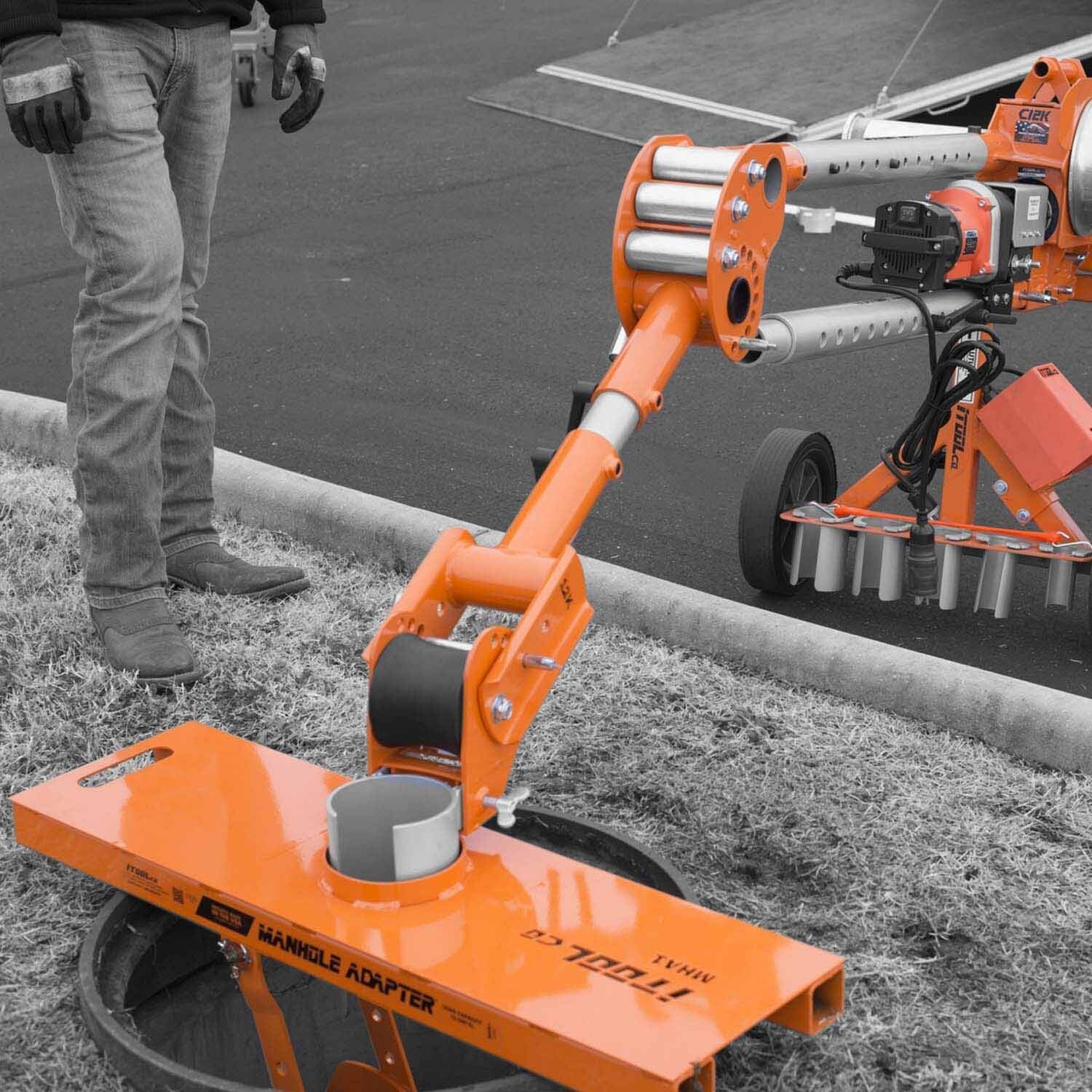 Steel Manhole Adapter provides a stable platform for positioning iTOOLco wire pullers over manholes; fits 18 in. – 36 in. openings and anchors securely for safer, more efficient pulls.