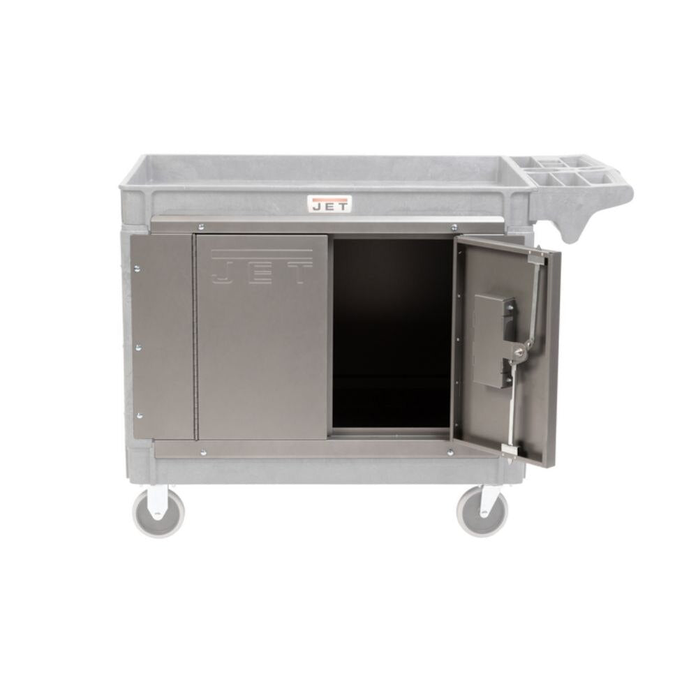 Load-N-Lock cart security systems are designed to support the needs of heavy industry service, office building maintenance, home workshops, and municipal service environments - Anywhere you need to have robust, secure mobility and easy access to contents. You can now confidently load, latch, lock, transfer, and have the ability to rapidly gain access to the items you placed into the cart. Ideal for environments where inventory control, theft, retention of stacked items, or simply items being ""borrowed"" from open carts are an everyday challenge. This product is an easy to use and install mobile worksite utility cart security system, offering superior load retention, protection, and simplified access. Key features include a heavily reinforced single-piece door frame to compliment rapid access through the double ""French Door"" design, a self-latching one-finger release handle, twin bolt steel security rods, anti-rattle bumpers, and knock-out provisions for power port installation. The design features heavy gauge steel throughout the product and simple attachment directly to the resin cart structure. The unique JET design works with the cart to create a more robust, rigid, durable, and secure system solution. This product is backed by the JET Red Assurance 2-Year Warranty"