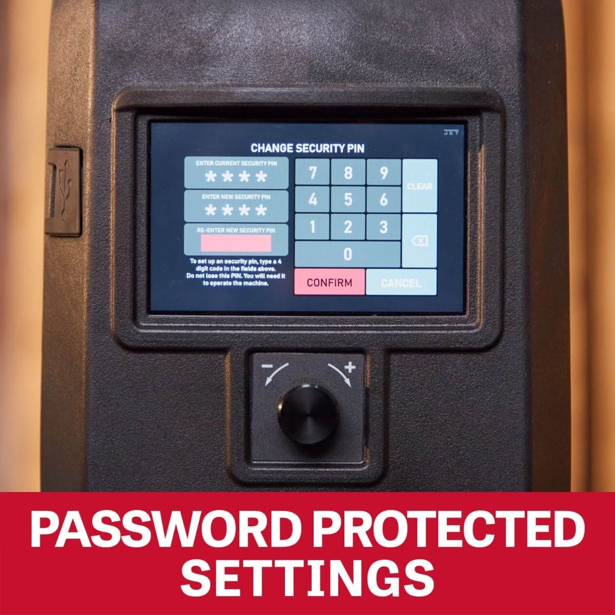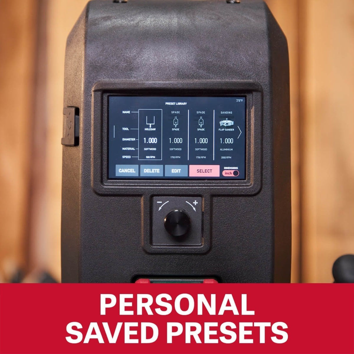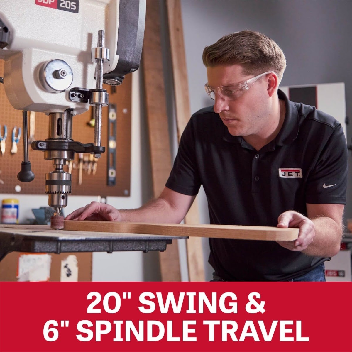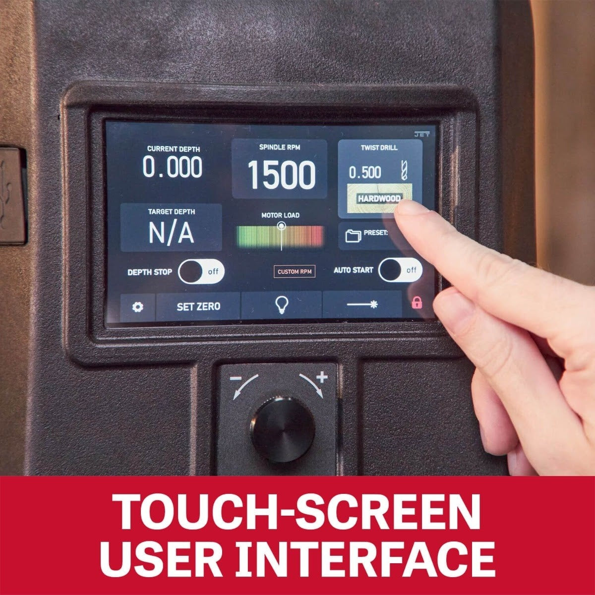 The JET JDP-20S Smart Drill Press delivers a 20 inch swing, 6 inch spindle travel, and variable speed control via an intuitive 5 inch touchscreen, with LED work light, laser guides, and a tilting cast iron table.