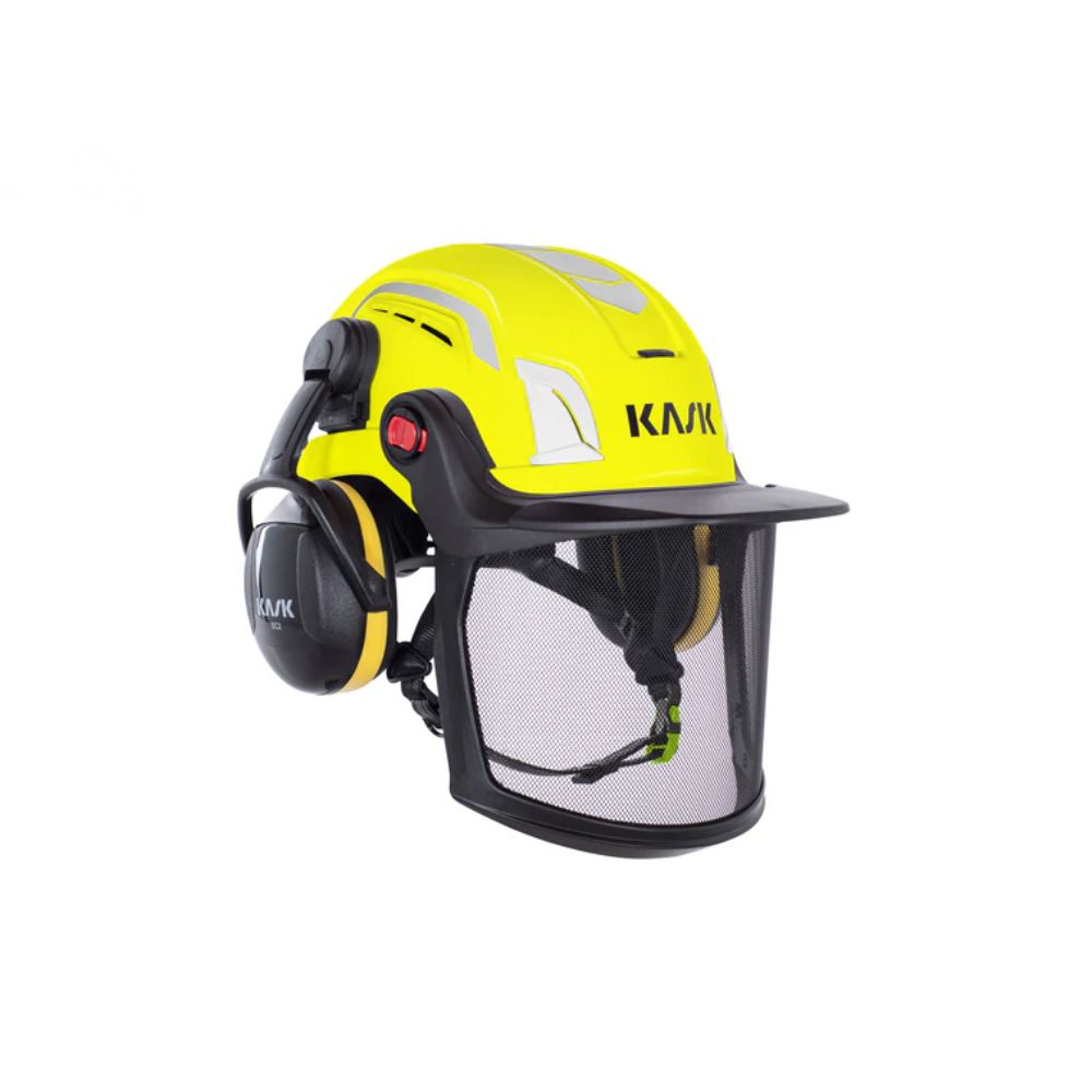 The Kask Zenith X Air Combo Helmet is lightweight, adjustable, and well-ventilated, and includes a metal mesh visor and earmuffs. The Zenith X Air Combo Helmet features impact protection (side, front, and rear) and a hypoallergenic and washable eco-leather chin strap with lateral adjustment and a loop to allow connection to the harness. Advanced moisture-wicking fabric with soft textiles provides enhanced user comfort, and Up & Down X technology allows for a precise fit and all-day comfort. Face, eye and ear protection attaches easily in integrated slots, and lamp clips include earplug holders for easy access to sound suppression. The padding is removable for washing, providing improved durability.