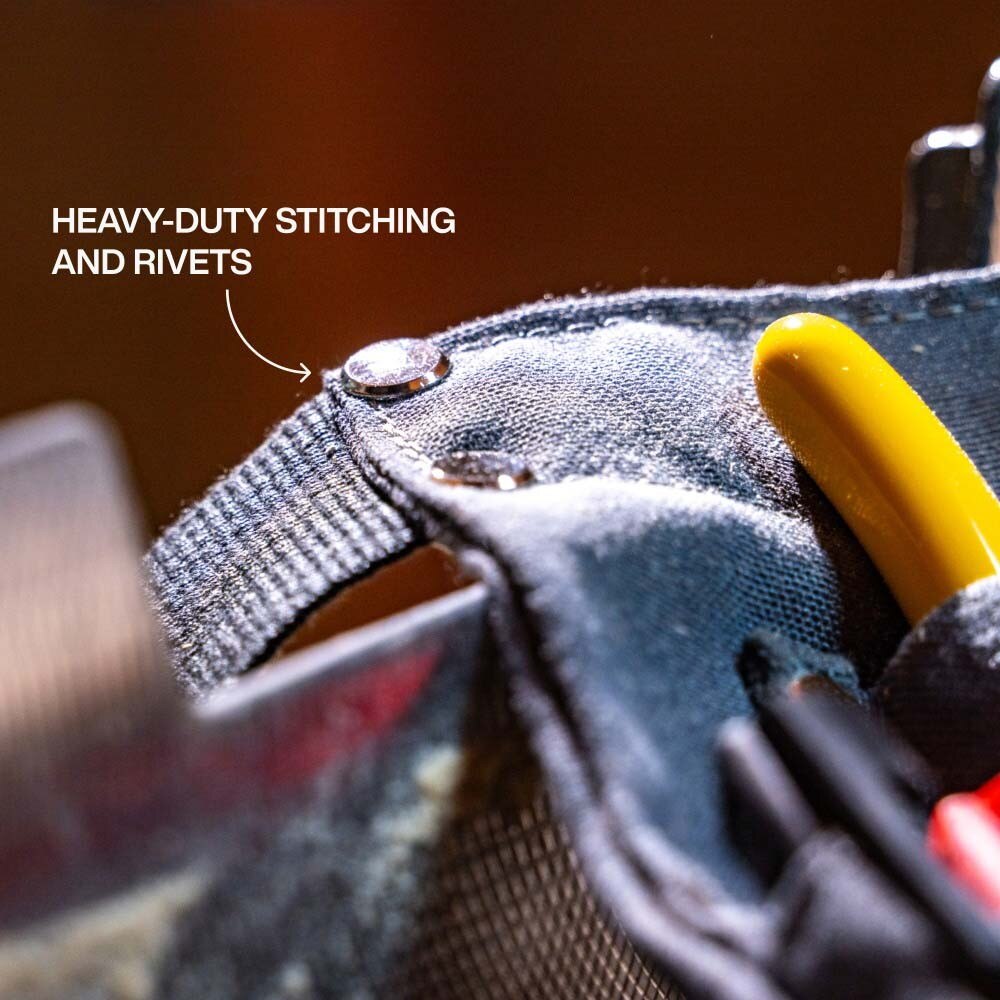 - Large rear pockets for tools and front pockets for small parts such as screws, nails, or wire nuts