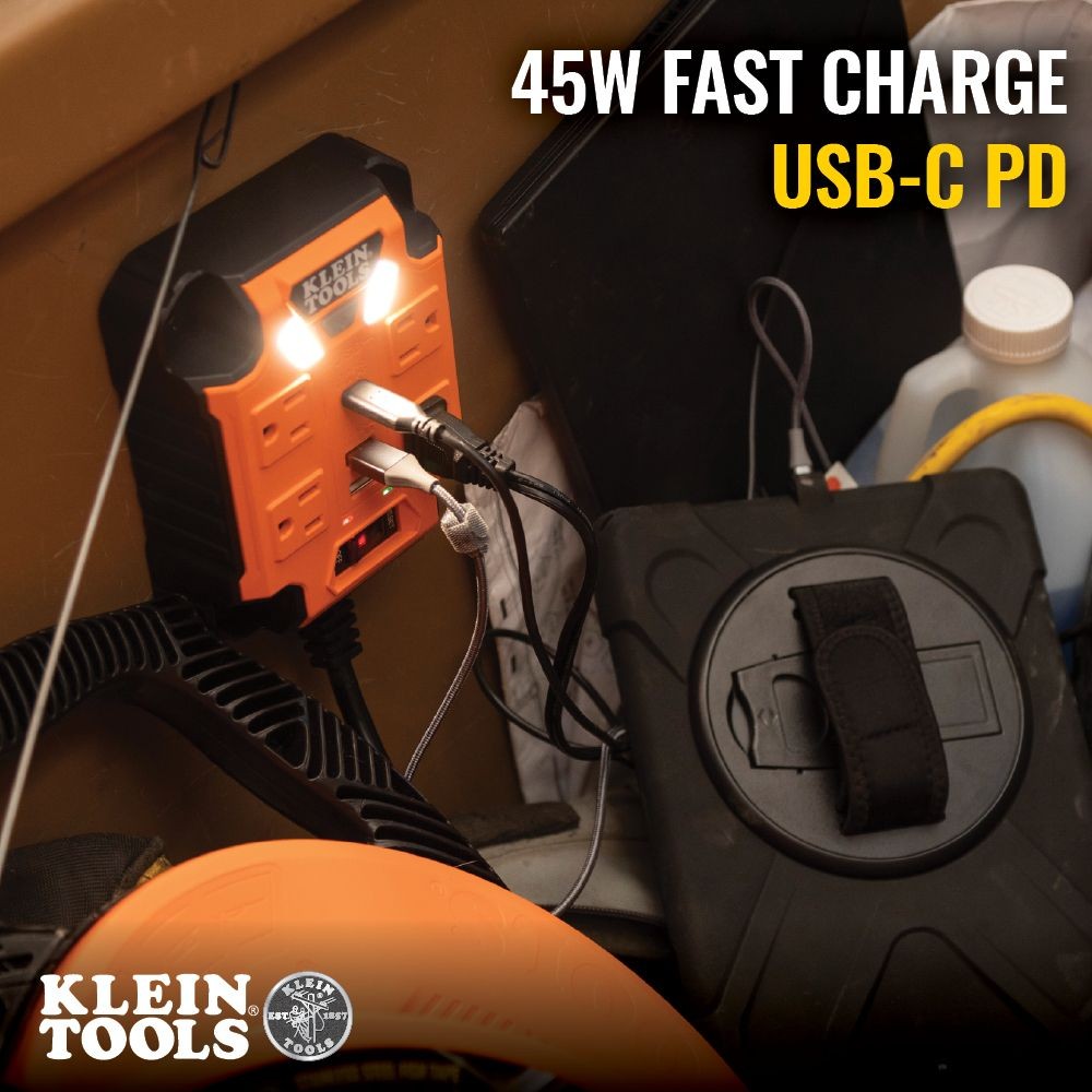 Klein Tools' rugged PowerBox uses powerful magnets to easily mount anywhere in the metal job box or other magnetic surface, and includes built-in hanging holes for fixed mounting locations. Easily distribute power across your job box with 5-Foot durable power cord. Integrated LED lighting illuminates the inside of any dark job box to quickly find gear. Besides the four surge protected 120V outlets, the two USB-A and one 45W USB-C (PD capable) ports allow for convenient charging of personal devices including phones, tablets, and laptops.