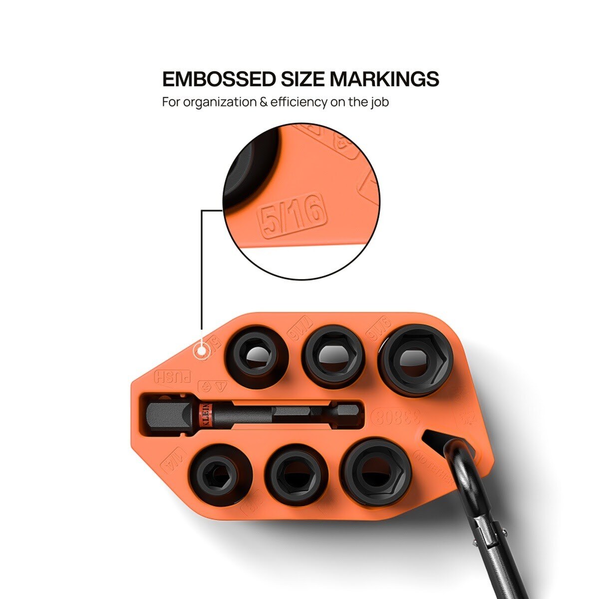 Compact SAE impact socket set with 3/8 inch drive features six 6?point sockets, a 1/4 inch impact adapter, and a carabiner-mounted TPV sleeve for quick access; cold?forged Cr?Mo construction with color-coded bands and stamped markings for fast identification.